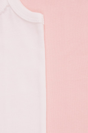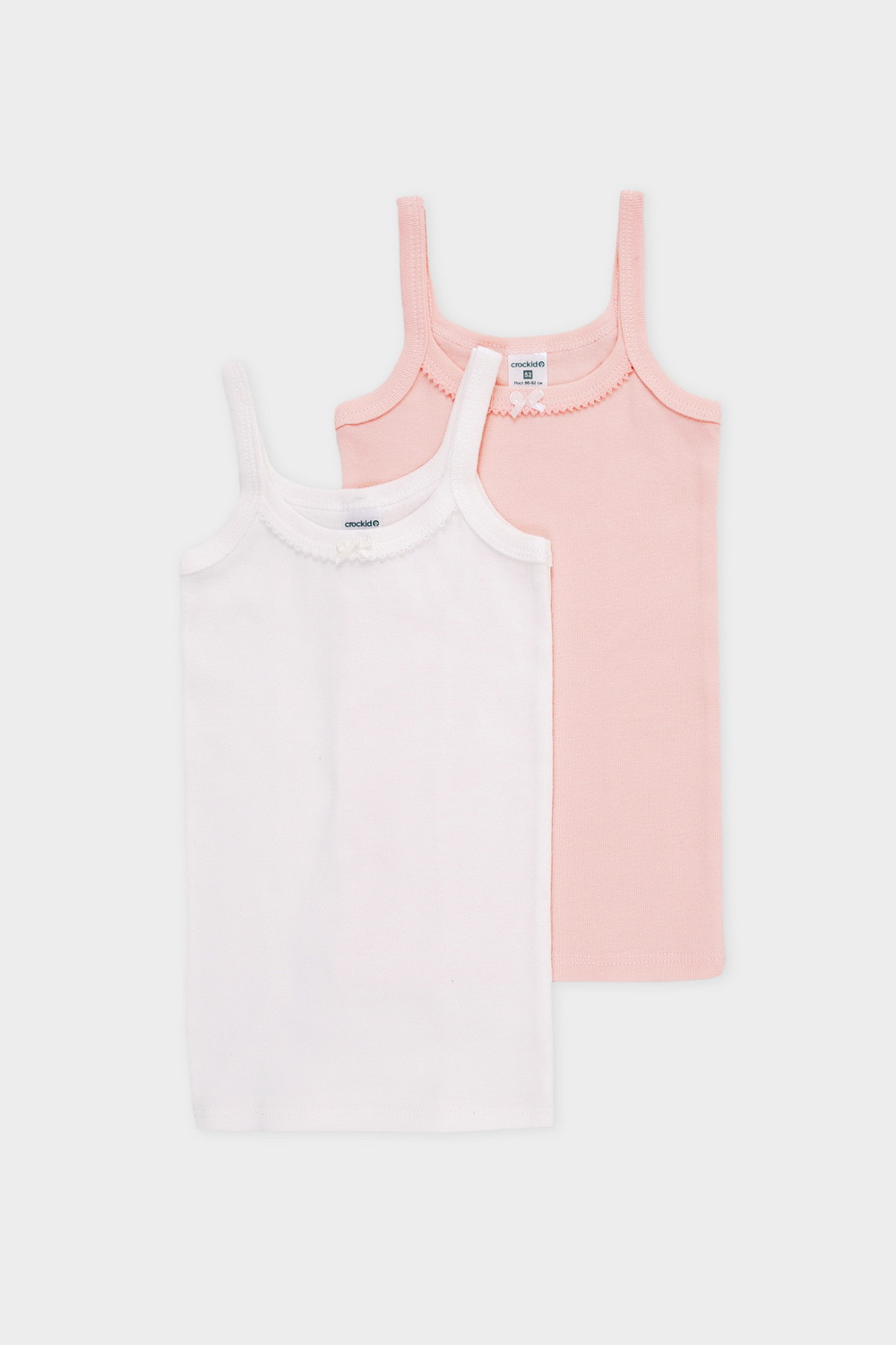 Трикотажные майки в комплекте 2 шт на тонких бретелях из однотонной рибаны, горловина и проймы обработаны кантом, по горловине полочки мережка и атласный бантик. Сохраняют цвет и форму после многократных стирок. Все трикотажные полотна производятся в соответсвии с нормами Швейцарского сертификата ЭкоТекс.