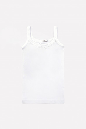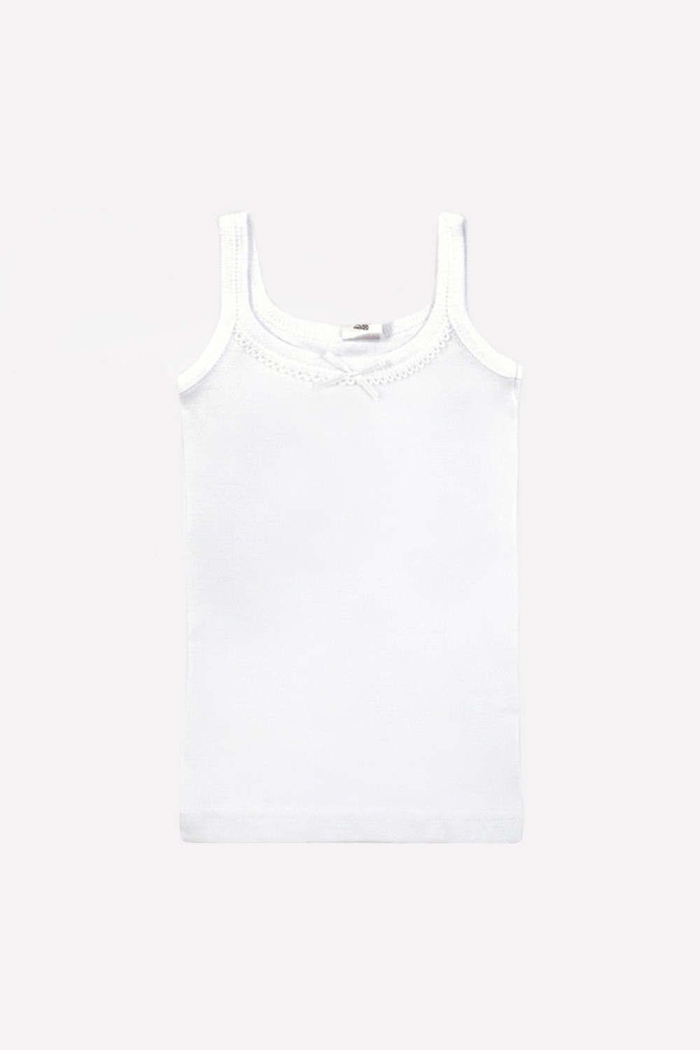 Майка на бретелях из однотонного ластика бесшовная, проймы и горловина обработаны бейкой, мережка по горловине, атласный бантик на полочке.
