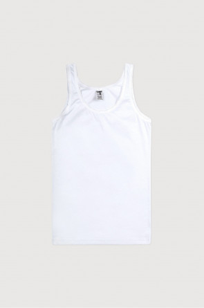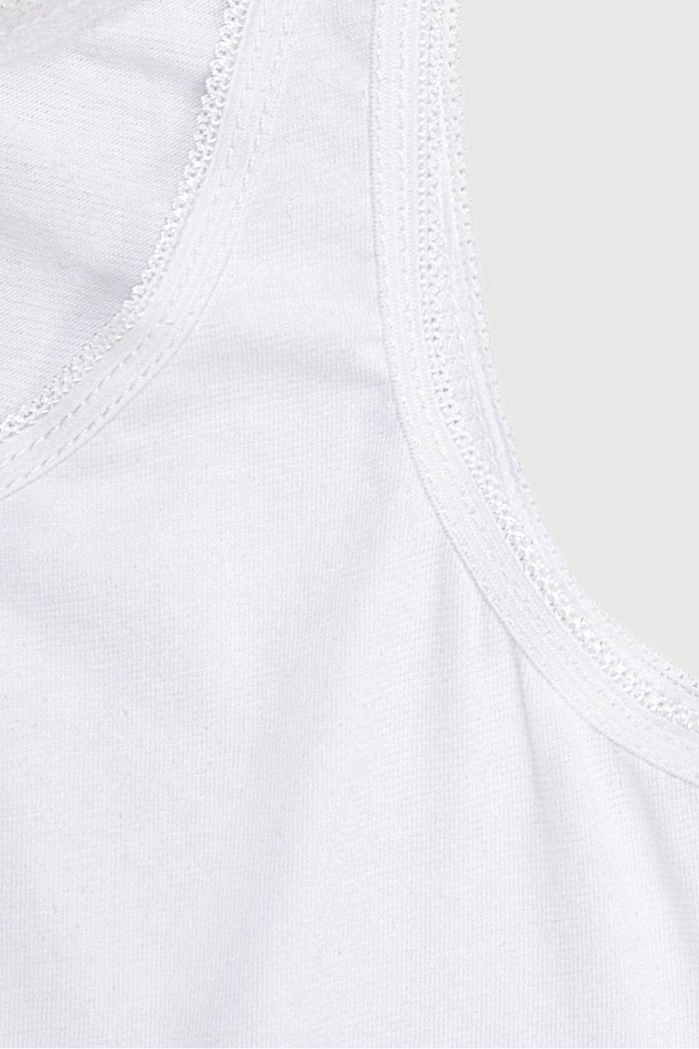 Майка для девочки однотонная из супрема с эластаном, горловина и проймы обработаны декоративной эластичной тесьмой.
