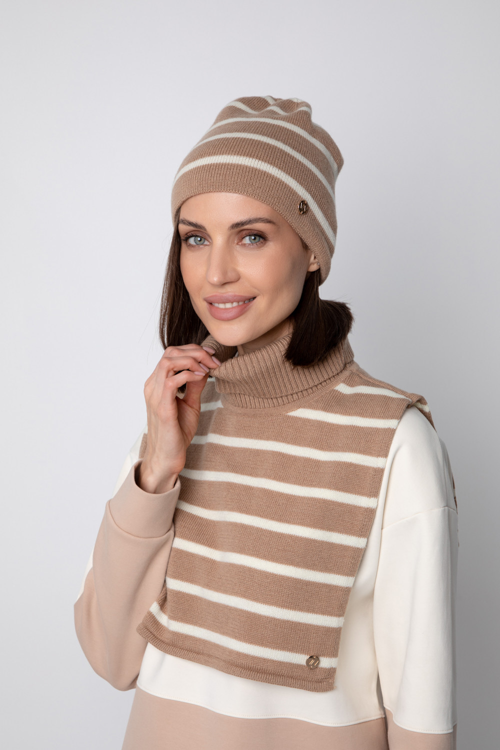 Уютная вязаная манишка с высоким воротником из шерсти и акрила. Шерсть в составе хорошо удерживает тепло, а волокна акрила делают изделие мягким и предотвращают деформацию и появление катышек. Лаконичный крой хорошо сочетается с верхней одеждой.