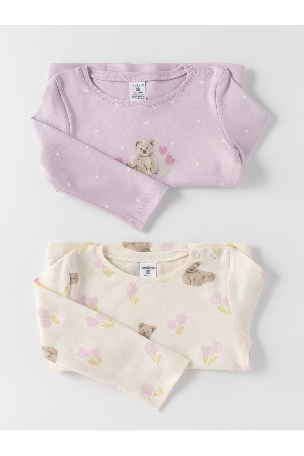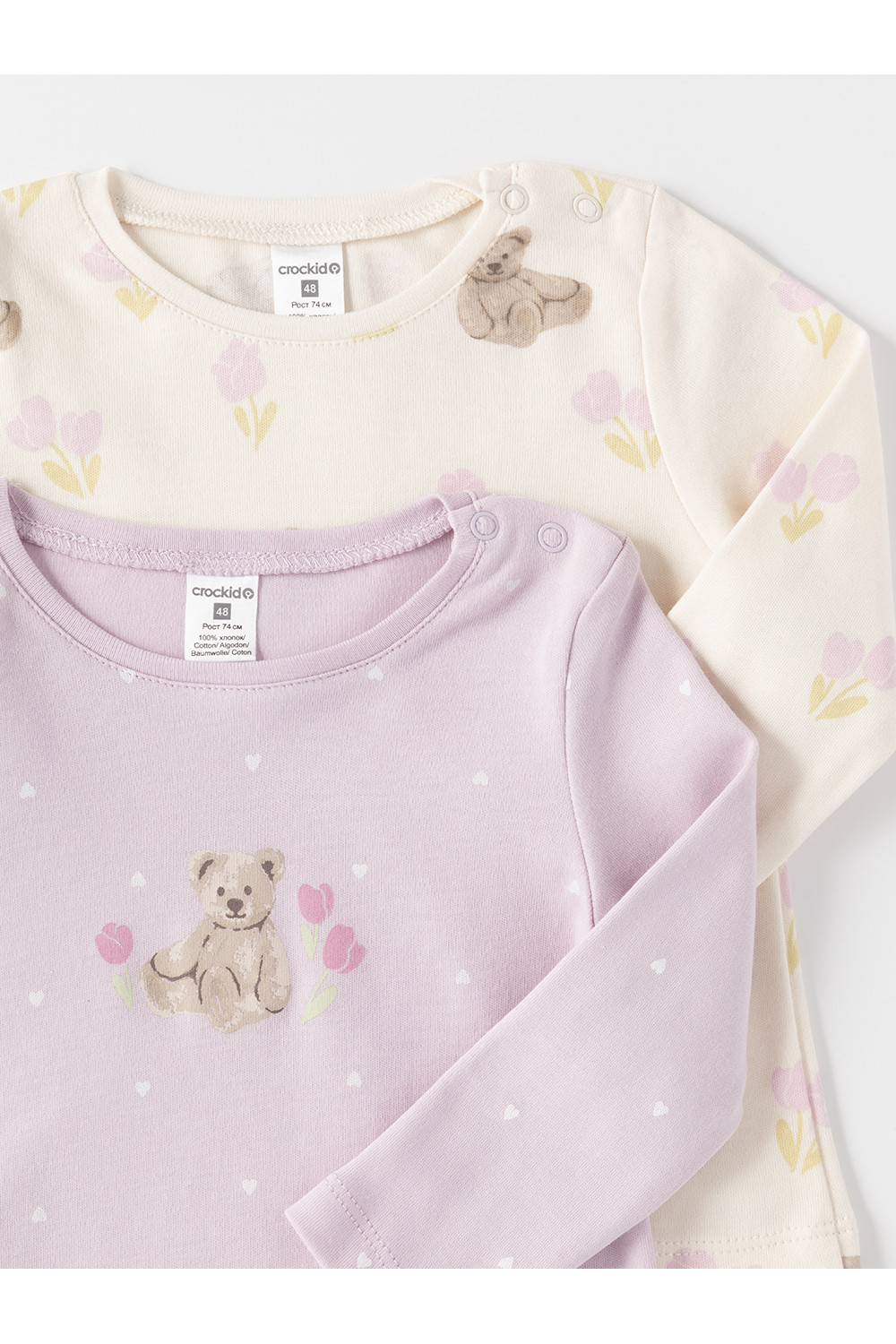 Джемперы лонгсливы для новорождённых из мягкого эластичного трикотажа интерлок, произведённого из натурального хлопка. В упаковке 2 штуки. Застёгиваются на плече на кнопки. Оригинальная набивка выполнена из стойких гипоаллергенных текстильных красителей. Все трикотажные полотна производятся в соответствии с нормами швейцарского сертификата ЭкоТекс.
