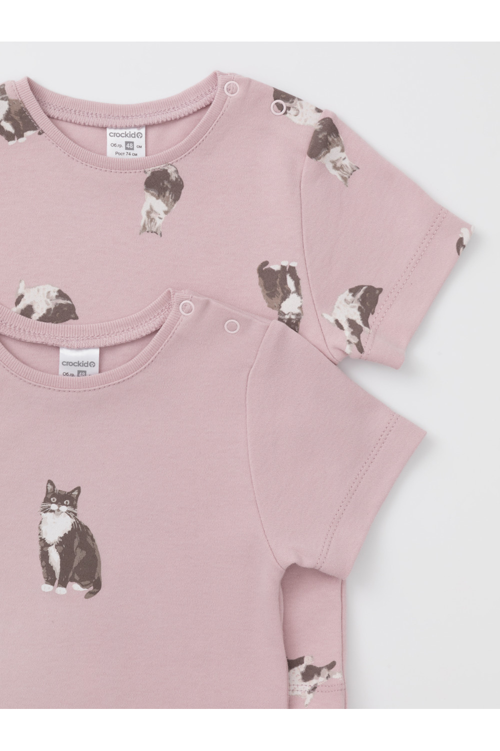 Футболки для девочки из высококачественного трикотажа интерлок. В упаковке 2 штуки. Для удобства на плече застёжка на кнопки. Оригинальная набивка и принт выполнены из стойких гипоаллергенных текстильных красителей. Все трикотажные полотна производятся в соответствии с нормами швейцарского сертификата ЭкоТекс.
