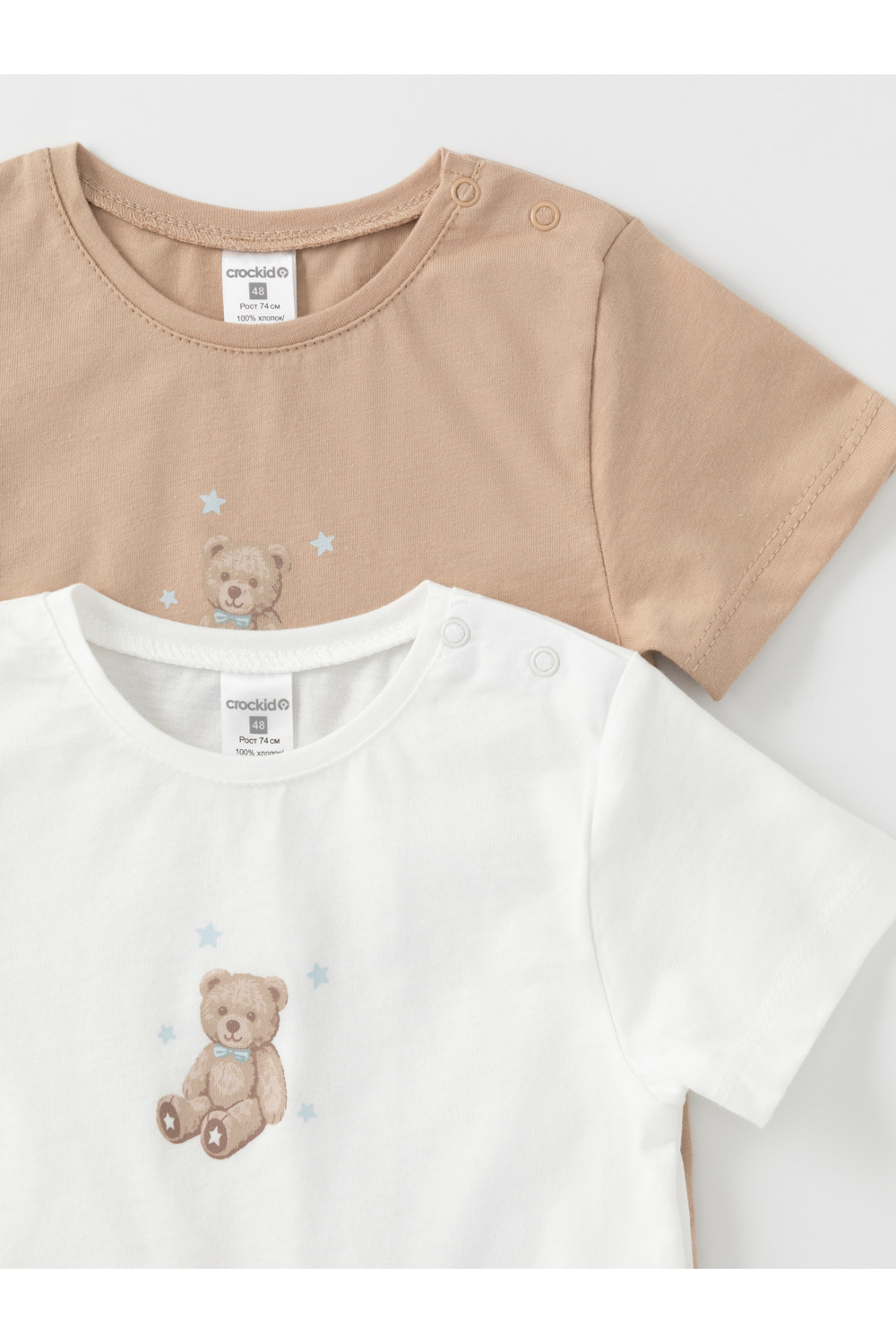 Футболки для мальчика из гладкого трикотажа супрем. В составе 100% натуральный хлопок высокого качества. В упаковке 2 штуки. Для удобства на плече застёжка на кнопки. Оригинальный принт выполнен из стойких гипоаллергенных текстильных красителей. Все трикотажные полотна производятся в соответствии с нормами швейцарского сертификата ЭкоТекс.