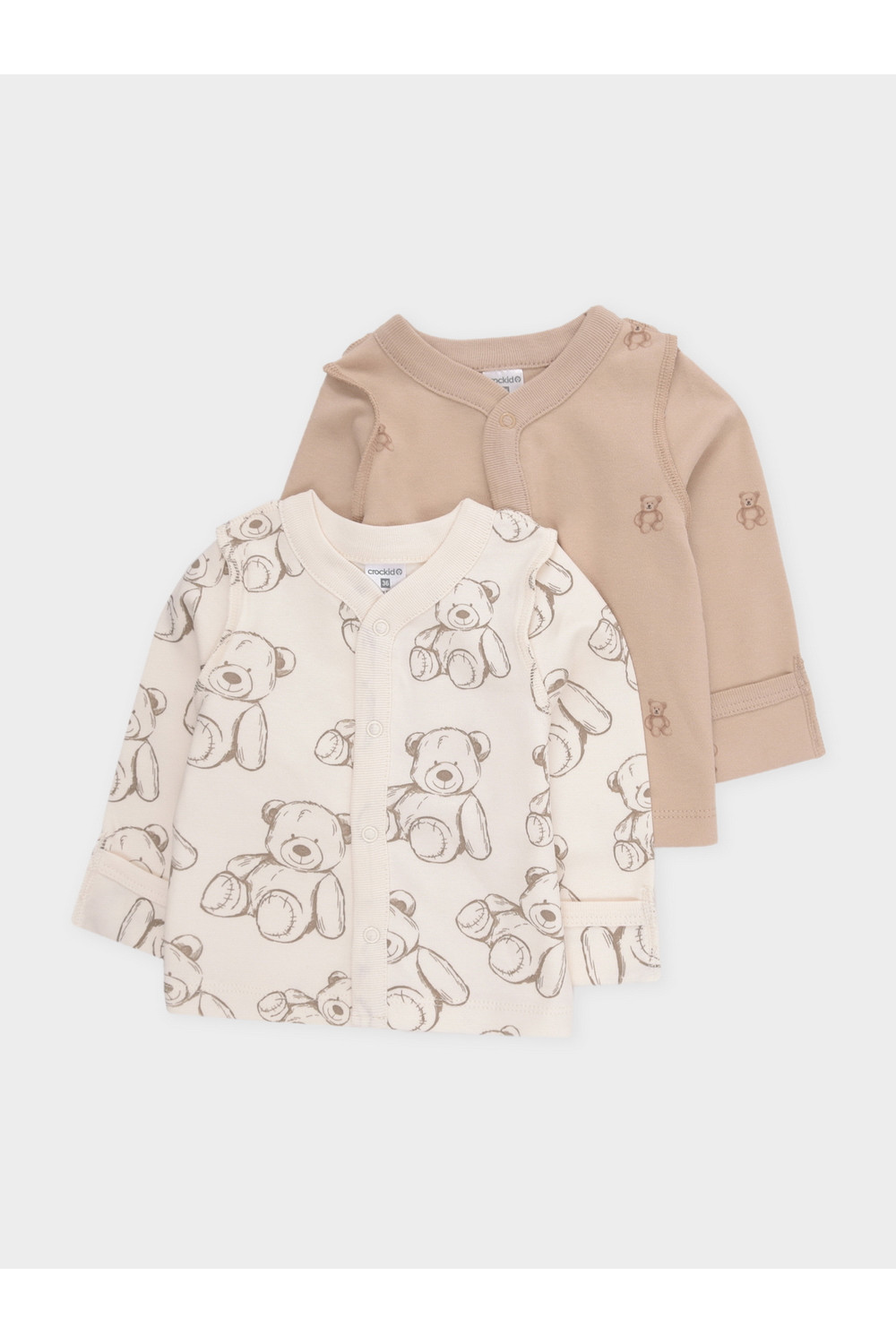 Кофточки для новорождённых из мягкого эластичного трикотажа интерлок, произведённого из натурального хлопка. В упаковке 2 штуки. Застёгиваются спереди на кнопки. В размере 56 на рукавах предусмотрены отвороты, швы выполнены наружу. Оригинальная набивка выполнена из стойких гипоаллергенных текстильных красителей. Все трикотажные полотна производятся в соответствии с нормами Швейцарского сертификата ЭкоТекс.