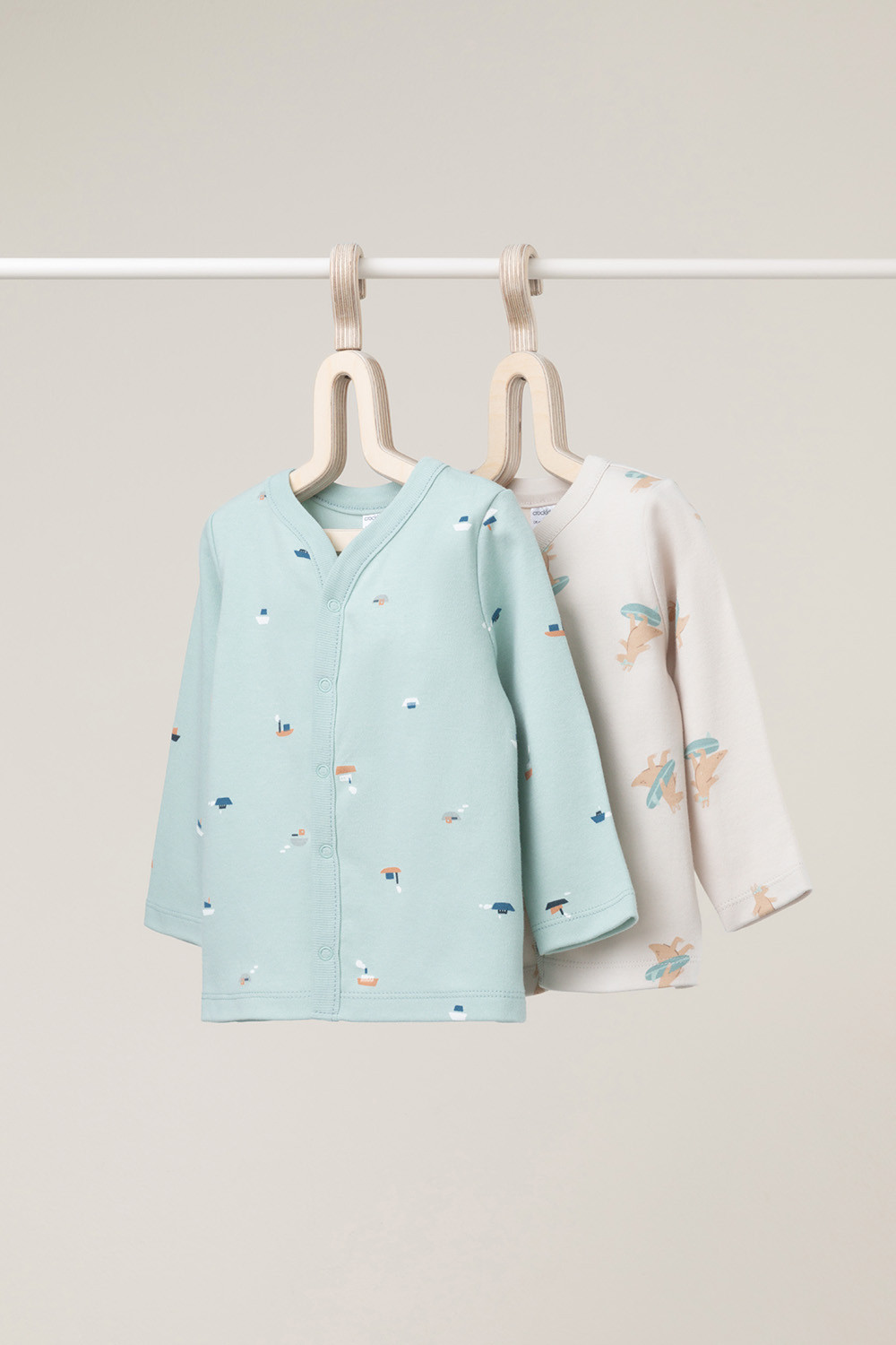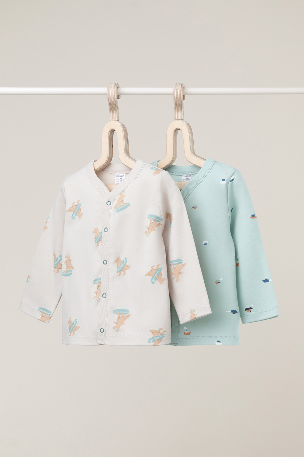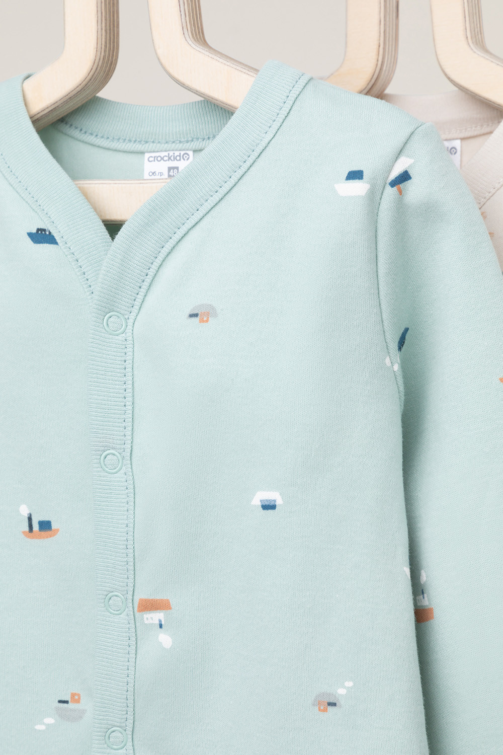 Кофточки для новорождённых из мягкого эластичного трикотажа интерлок, произведённого из натурального хлопка. В упаковке 2 штуки. Застёгиваются спереди на кнопки. В размере 56 на рукавах предусмотрены отвороты, швы выполнены наружу. Оригинальная набивка выполнена из стойких гипоаллергенных текстильных красителей. Все трикотажные полотна производятся в соответствии с нормами Швейцарского сертификата ЭкоТекс.