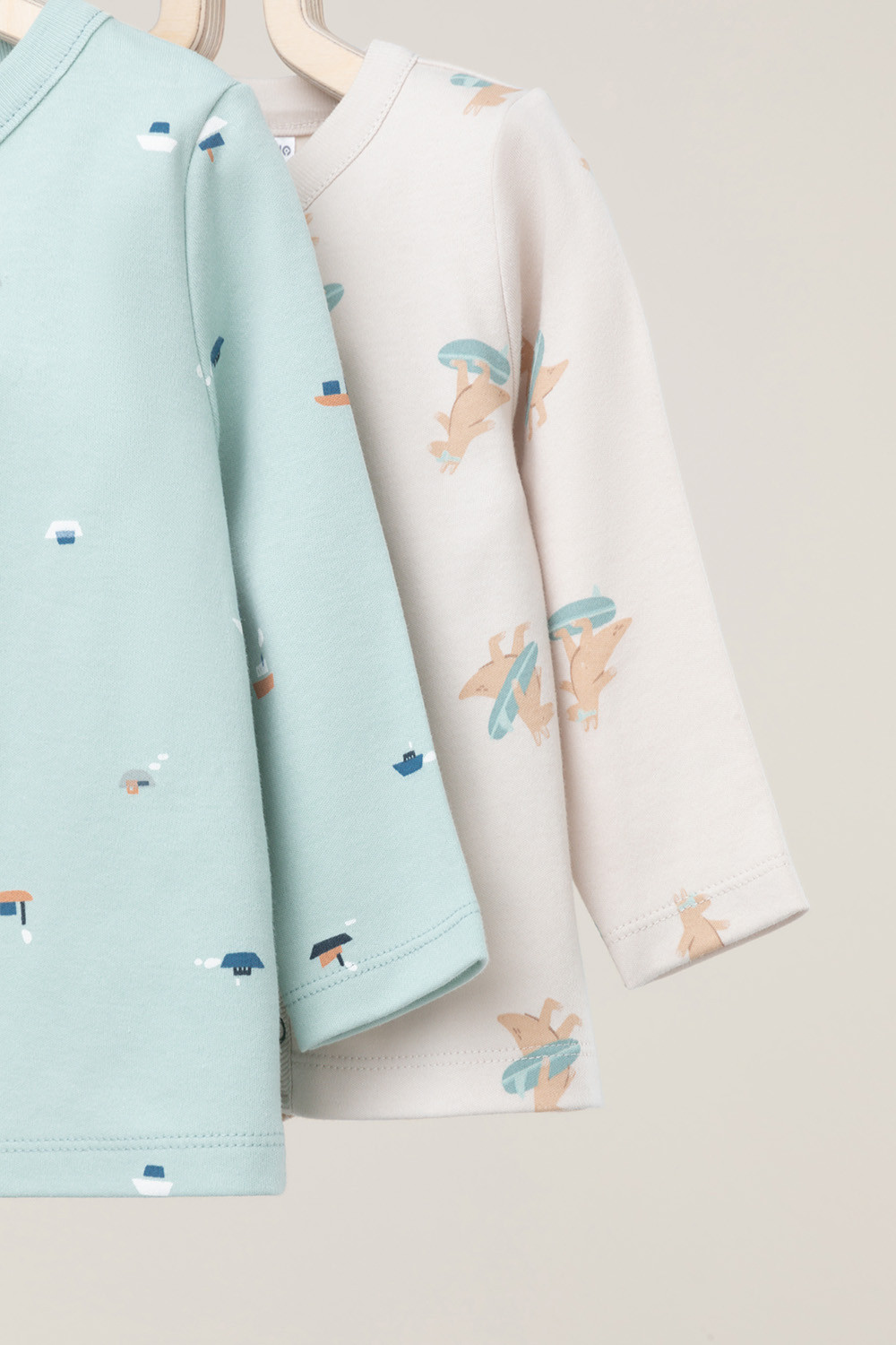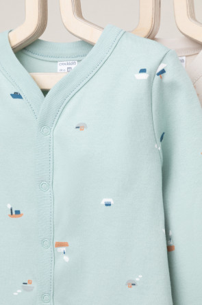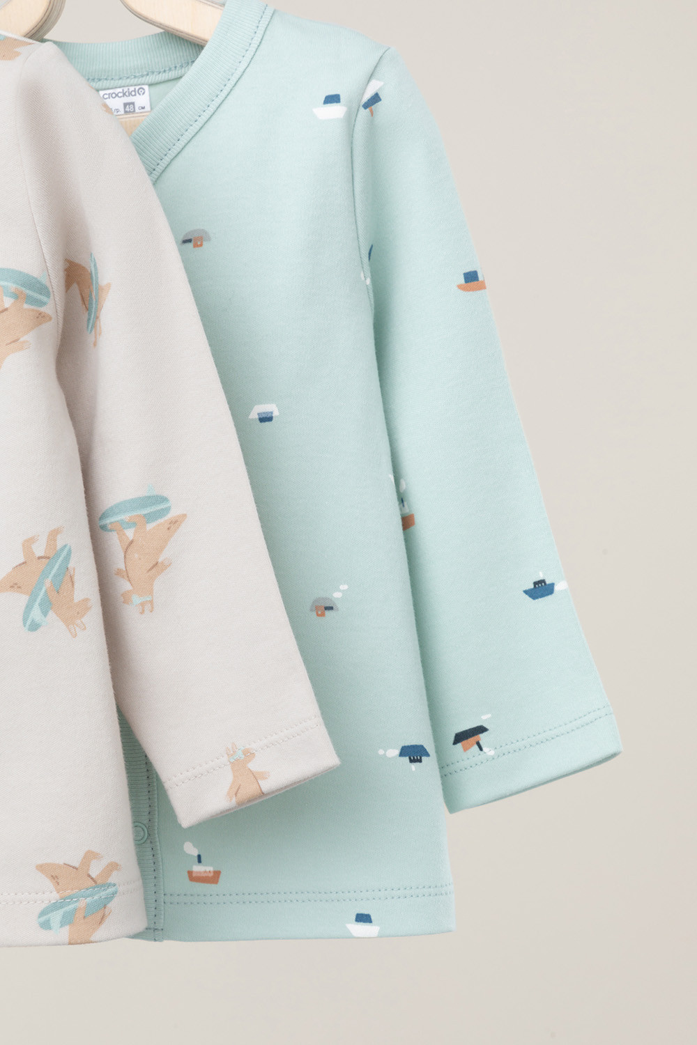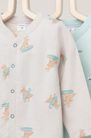 Кофточки для новорождённых из мягкого эластичного трикотажа интерлок, произведённого из натурального хлопка. В упаковке 2 штуки. Застёгиваются спереди на кнопки. В размере 56 на рукавах предусмотрены отвороты, швы выполнены наружу. Оригинальная набивка выполнена из стойких гипоаллергенных текстильных красителей. Все трикотажные полотна производятся в соответствии с нормами Швейцарского сертификата ЭкоТекс.