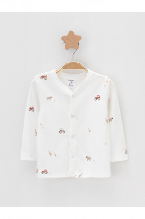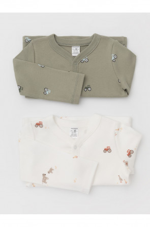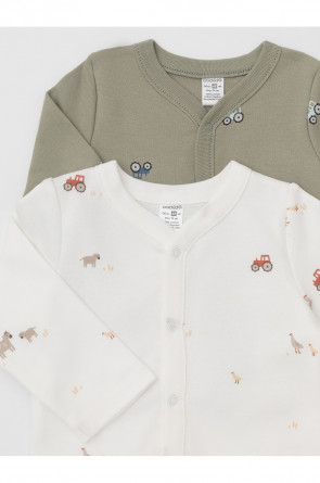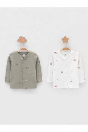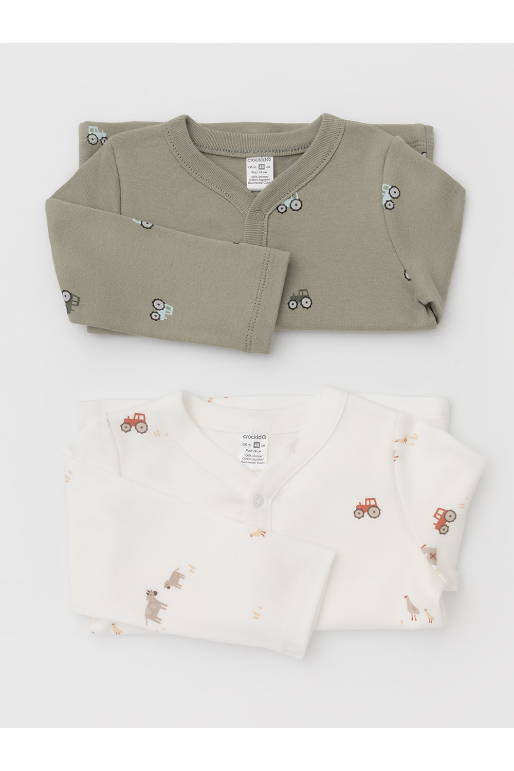 Кофточки для новорождённых из мягкого эластичного трикотажа интерлок, произведённого из натурального хлопка. В упаковке 2 штуки. Застёгиваются спереди на кнопки. В размере 56 на рукавах предусмотрены отвороты, швы выполнены наружу. Оригинальная набивка выполнена из стойких гипоаллергенных текстильных красителей. Все трикотажные полотна производятся в соответствии с нормами Швейцарского сертификата ЭкоТекс.