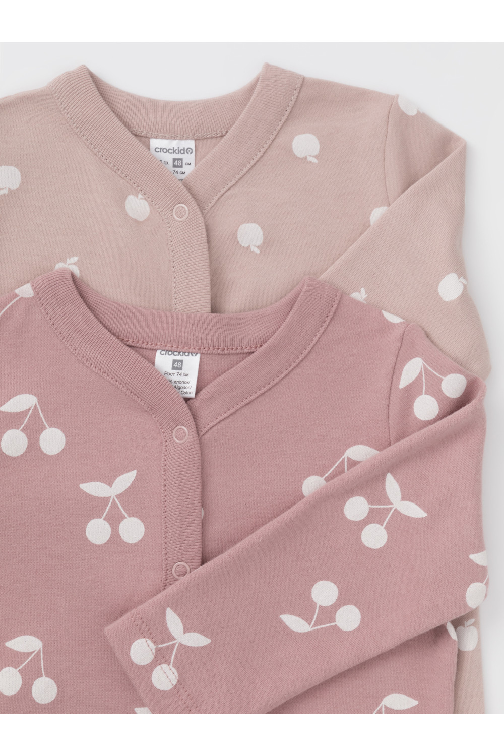 Кофточки для новорождённых из мягкого эластичного трикотажа интерлок, произведённого из натурального хлопка. В упаковке 2 штуки. Застёгиваются спереди на кнопки. В размере 56 на рукавах предусмотрены отвороты, швы выполнены наружу. Оригинальная набивка выполнена из стойких гипоаллергенных текстильных красителей. Все трикотажные полотна производятся в соответствии с нормами Швейцарского сертификата ЭкоТекс.