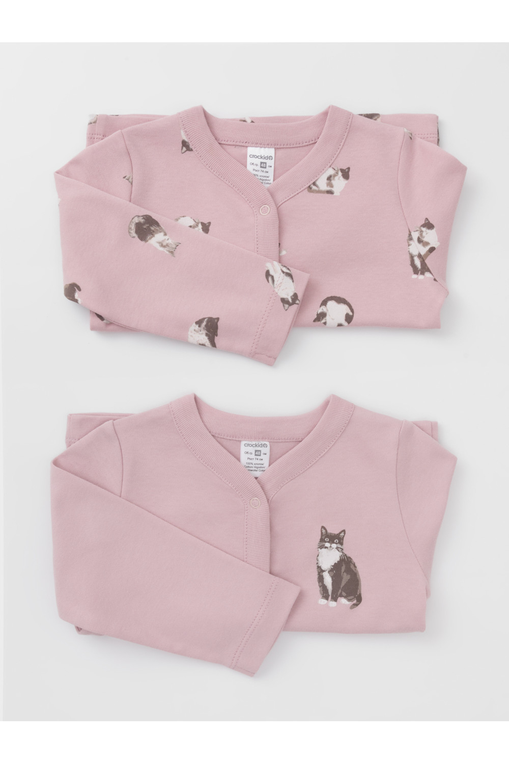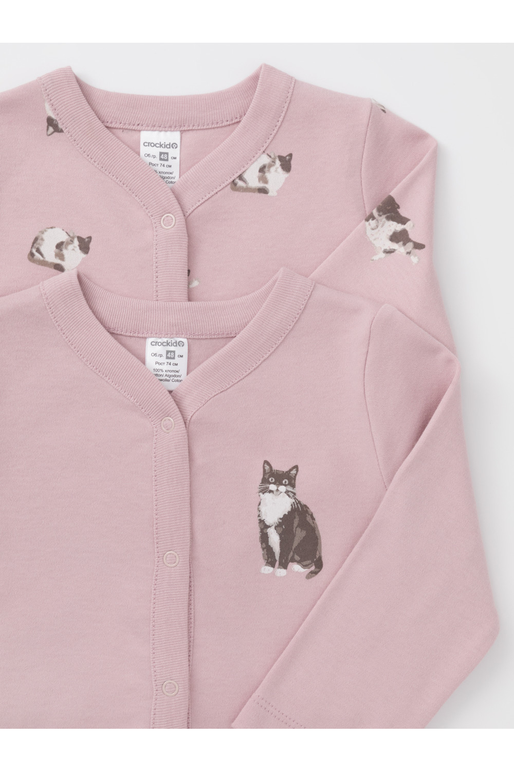 Кофточки для новорождённых из мягкого эластичного трикотажа интерлок, произведённого из натурального хлопка. В упаковке 2 штуки. Застёгиваются спереди на кнопки. В размере 56 на рукавах предусмотрены отвороты, швы выполнены наружу. Оригинальная набивка и принт выполнены из стойких гипоаллергенных текстильных красителей. Все трикотажные полотна производятся в соответствии с нормами Швейцарского сертификата ЭкоТекс.