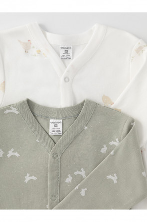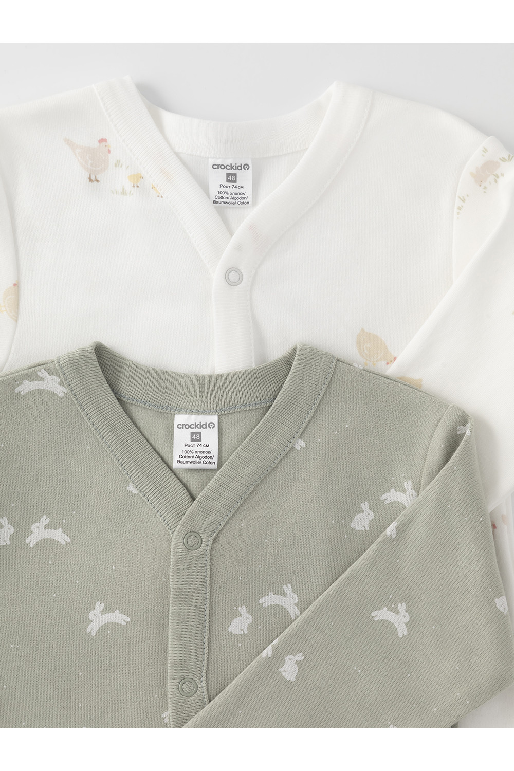 Комбинезоны для новорождённых из мягкого эластичного трикотажа интерлок, произведённого из натурального хлопка. В упаковке 2 штуки. Застёгиваются спереди на кнопки. В размере 56 на рукавах предусмотрены антицарапки, швы выполнены наружу. Оригинальная набивка выполнена из стойких гипоаллергенных текстильных красителей. Все трикотажные полотна производятся в соответствии с нормами швейцарского сертификата ЭкоТекс.