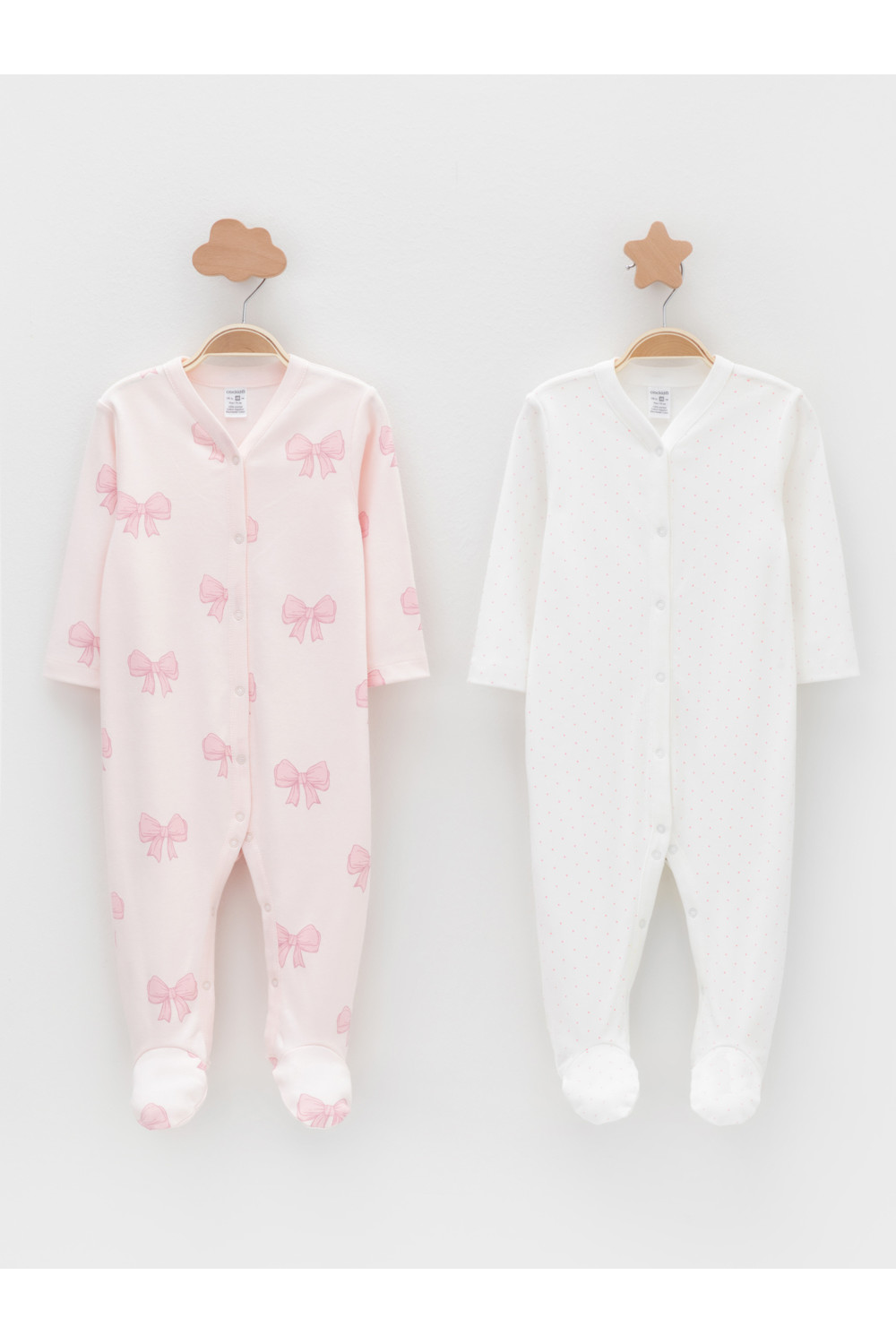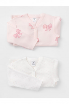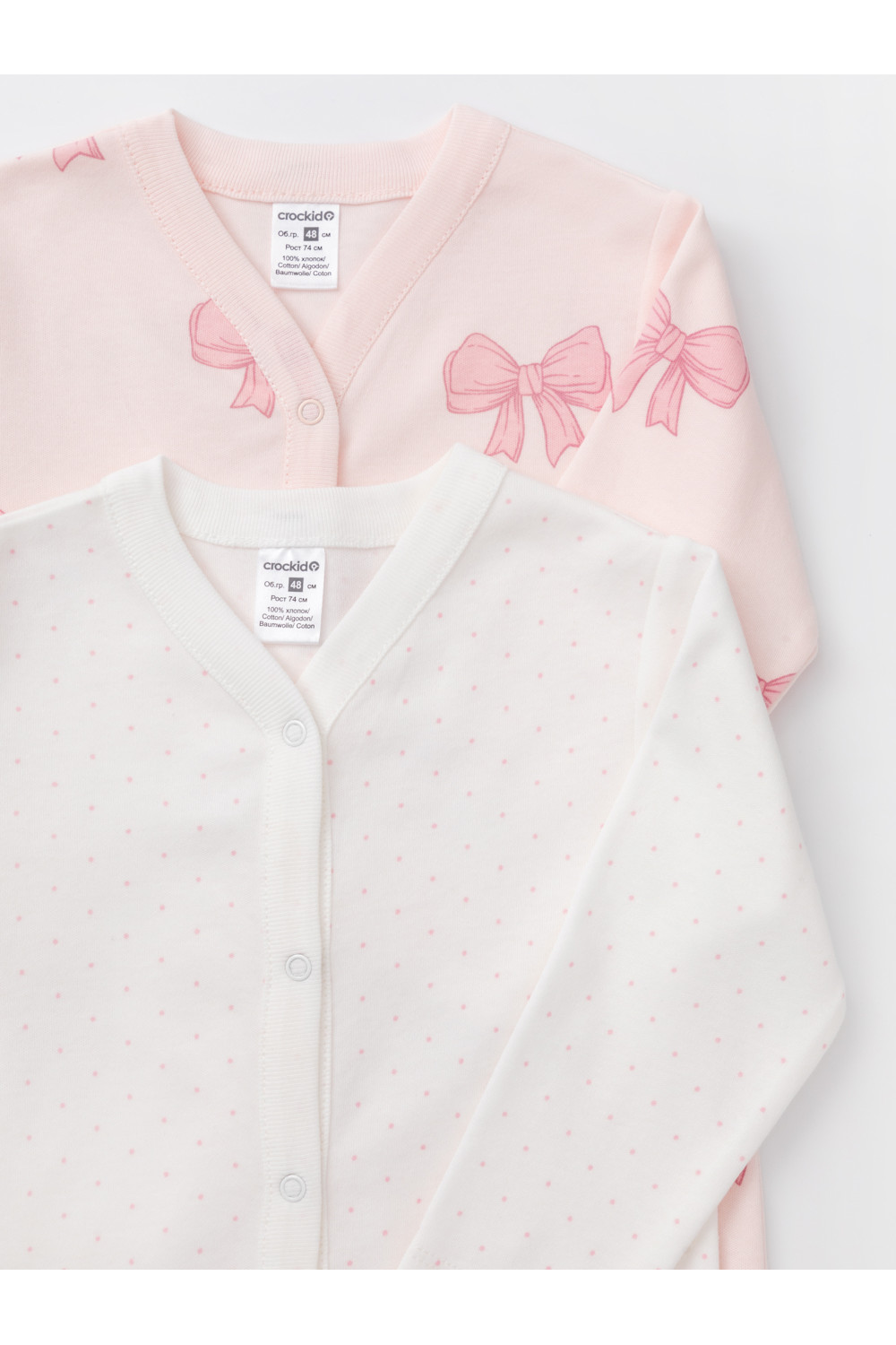 Комбинезоны для новорождённых из мягкого эластичного трикотажа интерлок, произведённого из натурального хлопка. В упаковке 2 штуки. Застёгиваются спереди на кнопки. В размере 56 на рукавах предусмотрены антицарапки, швы выполнены наружу. Оригинальная набивка выполнена из стойких гипоаллергенных текстильных красителей. Все трикотажные полотна производятся в соответствии с нормами швейцарского сертификата ЭкоТекс.