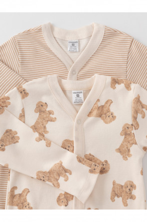 Комбинезоны для новорождённых из мягкого эластичного трикотажа интерлок, произведённого из натурального хлопка. В упаковке 2 штуки. Застёгиваются спереди на кнопки. В размере 56 на рукавах предусмотрены антицарапки, швы выполнены наружу. Оригинальная набивка выполнена из стойких гипоаллергенных текстильных красителей. Все трикотажные полотна производятся в соответствии с нормами швейцарского сертификата ЭкоТекс.