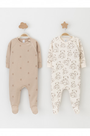 Комбинезоны для новорождённых из мягкого эластичного трикотажа интерлок, произведённого из натурального хлопка. В упаковке 2 штуки. Застёгиваются сбоку на молнию с мягкой защитой шеи и подбородка. Длинные рукава-реглан оканчиваются манжетами. Оригинальная набивка выполнена из стойких гипоаллергенных текстильных красителей. Все трикотажные полотна производятся в соответствии с нормами швейцарского сертификата ЭкоТекс.