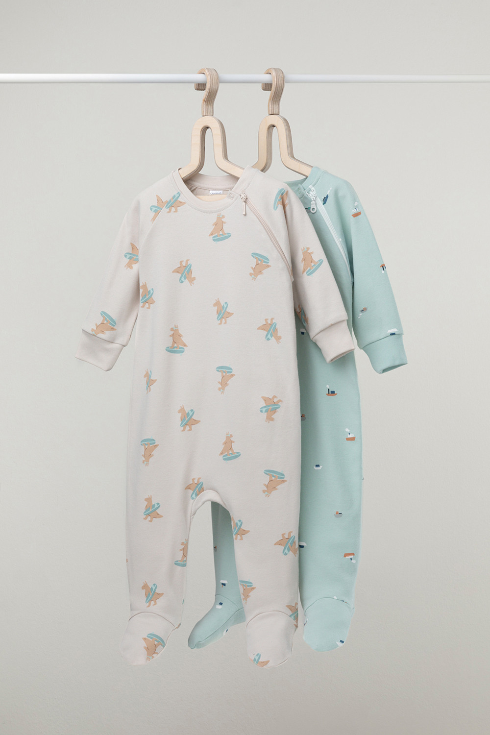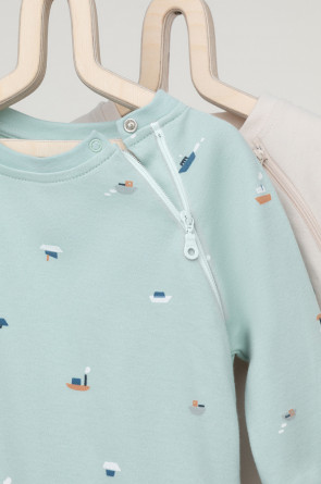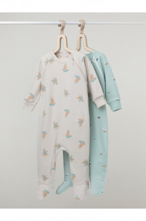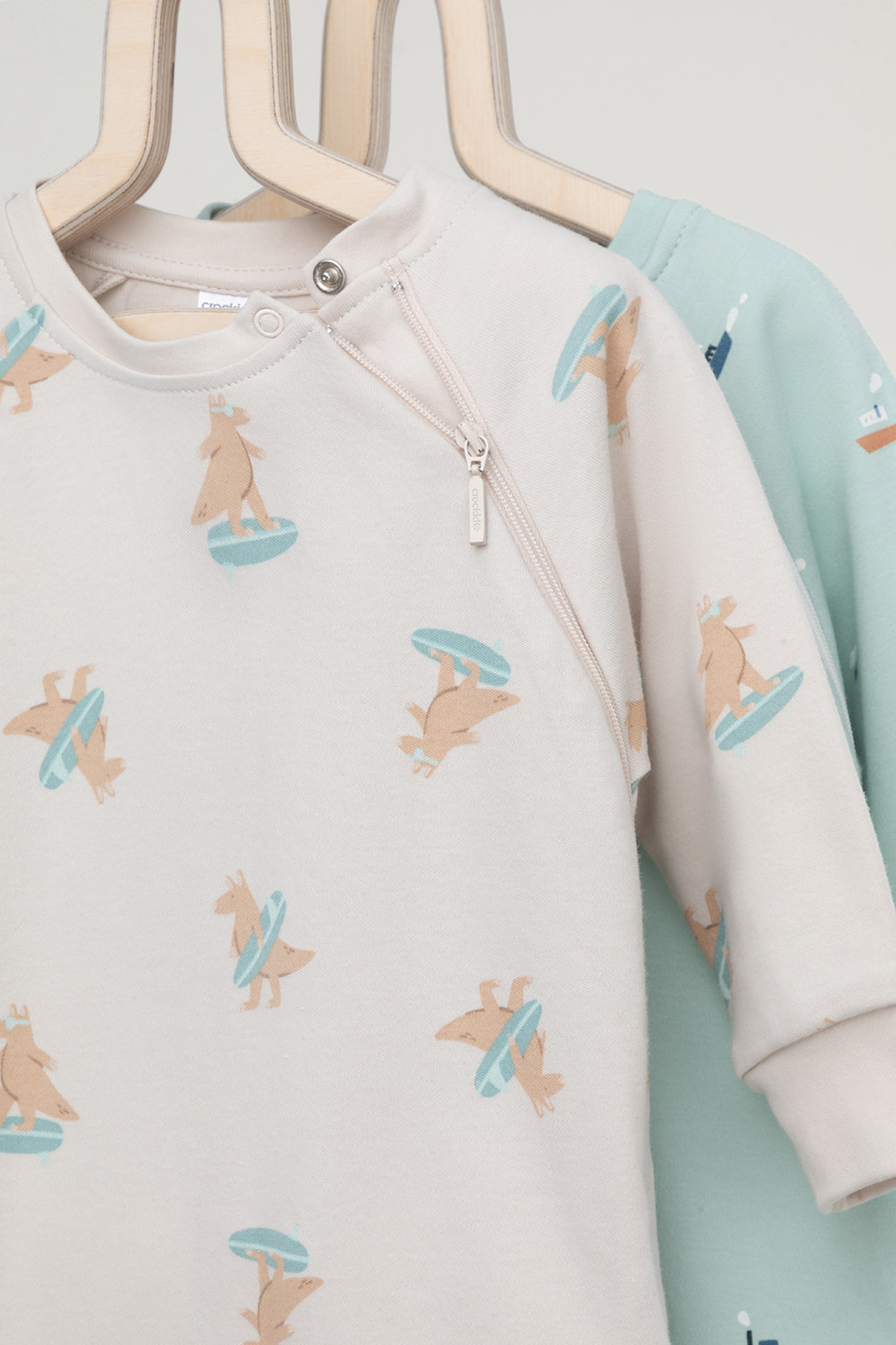 Комбинезоны для новорождённых из мягкого эластичного трикотажа интерлок, произведённого из натурального хлопка. В упаковке 2 штуки. Застёгиваются сбоку на молнию и на кнопку. Длинные рукава-реглан оканчиваются манжетами. Оригинальная набивка выполнена из стойких гипоаллергенных текстильных красителей. Все трикотажные полотна производятся в соответствии с нормами Швейцарского сертификата ЭкоТекс.