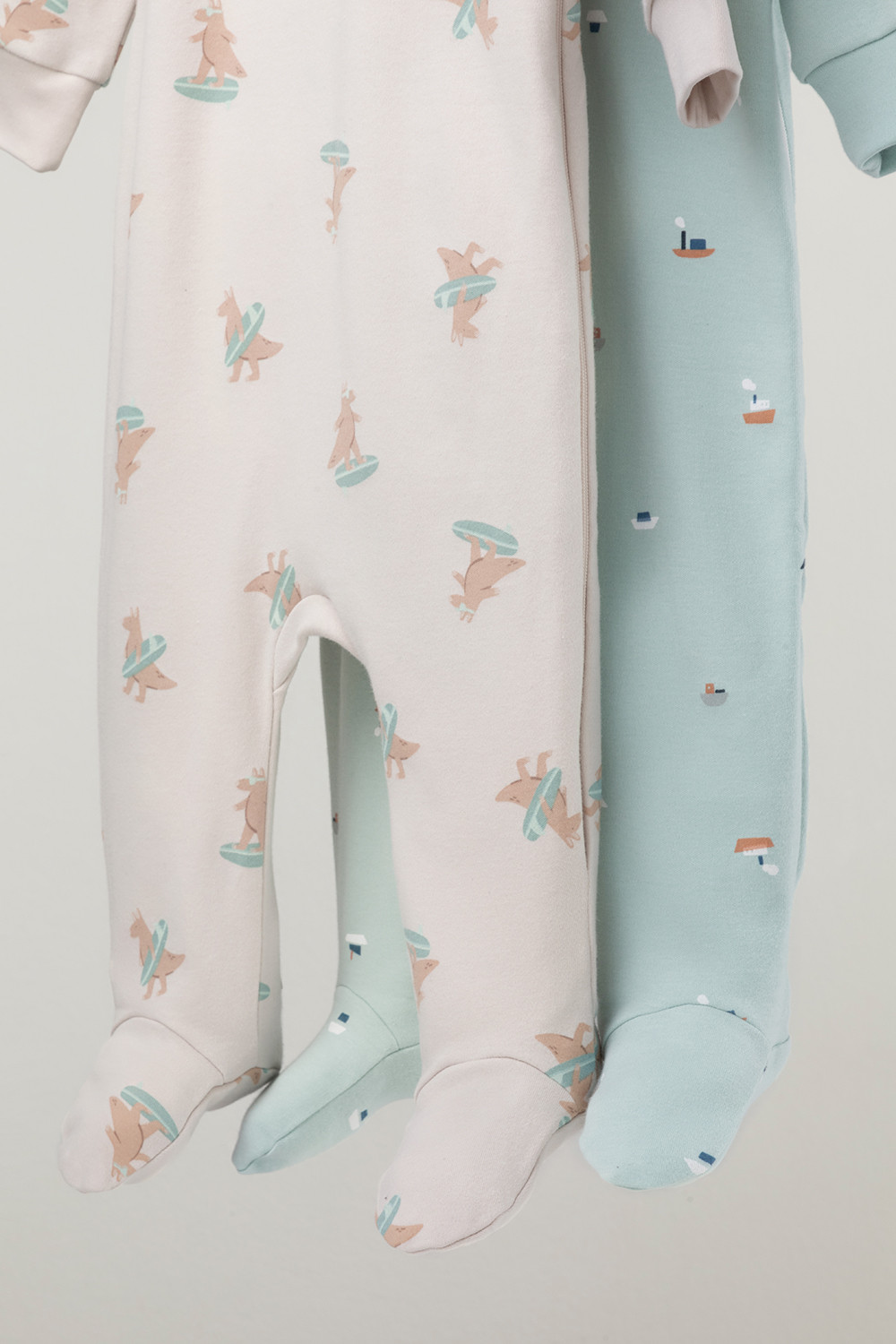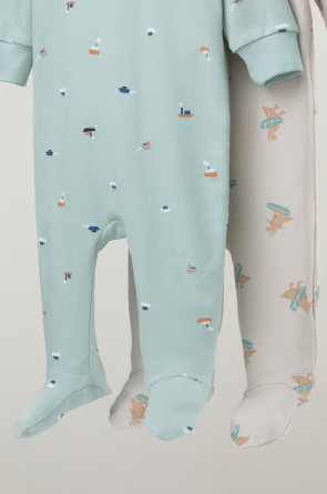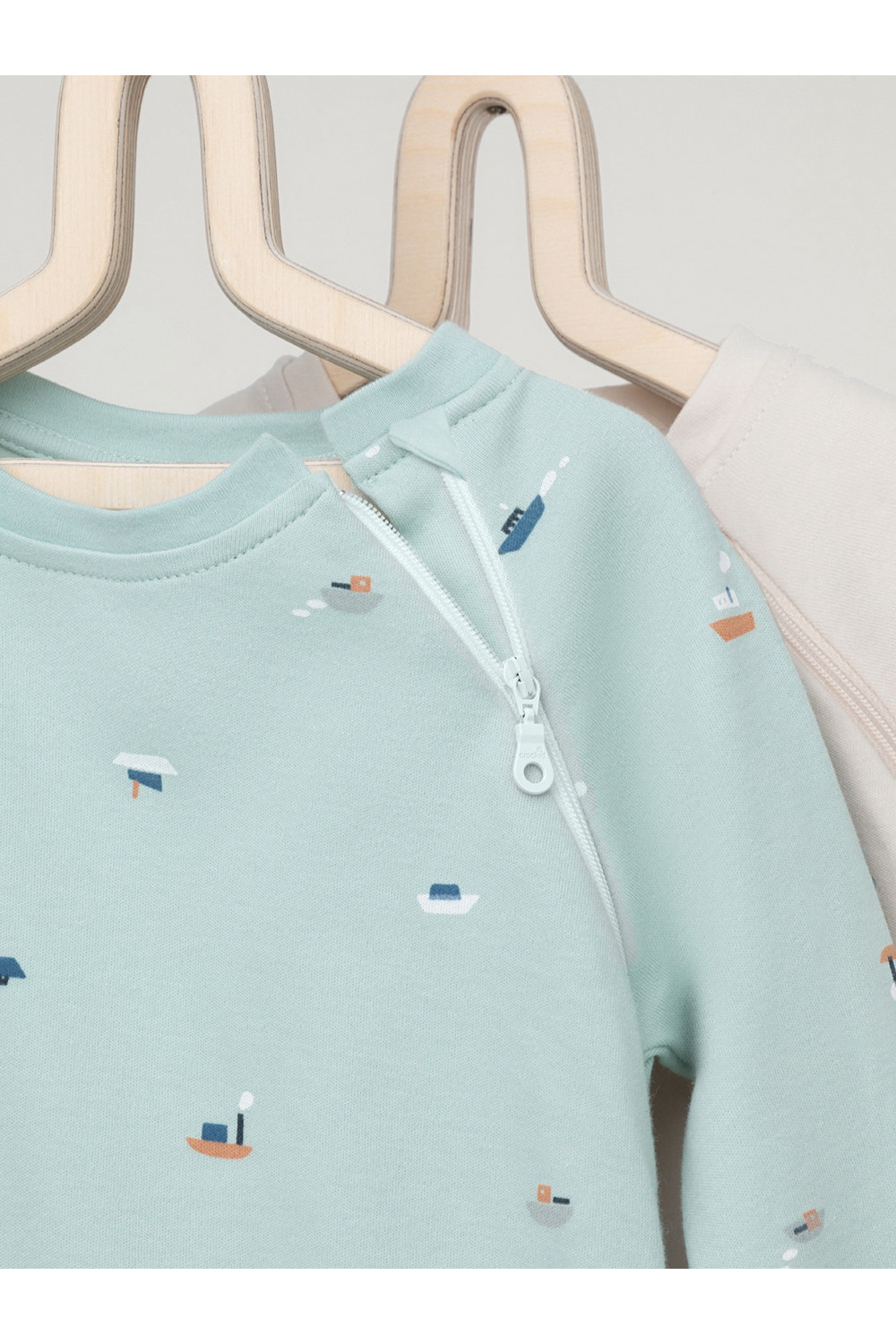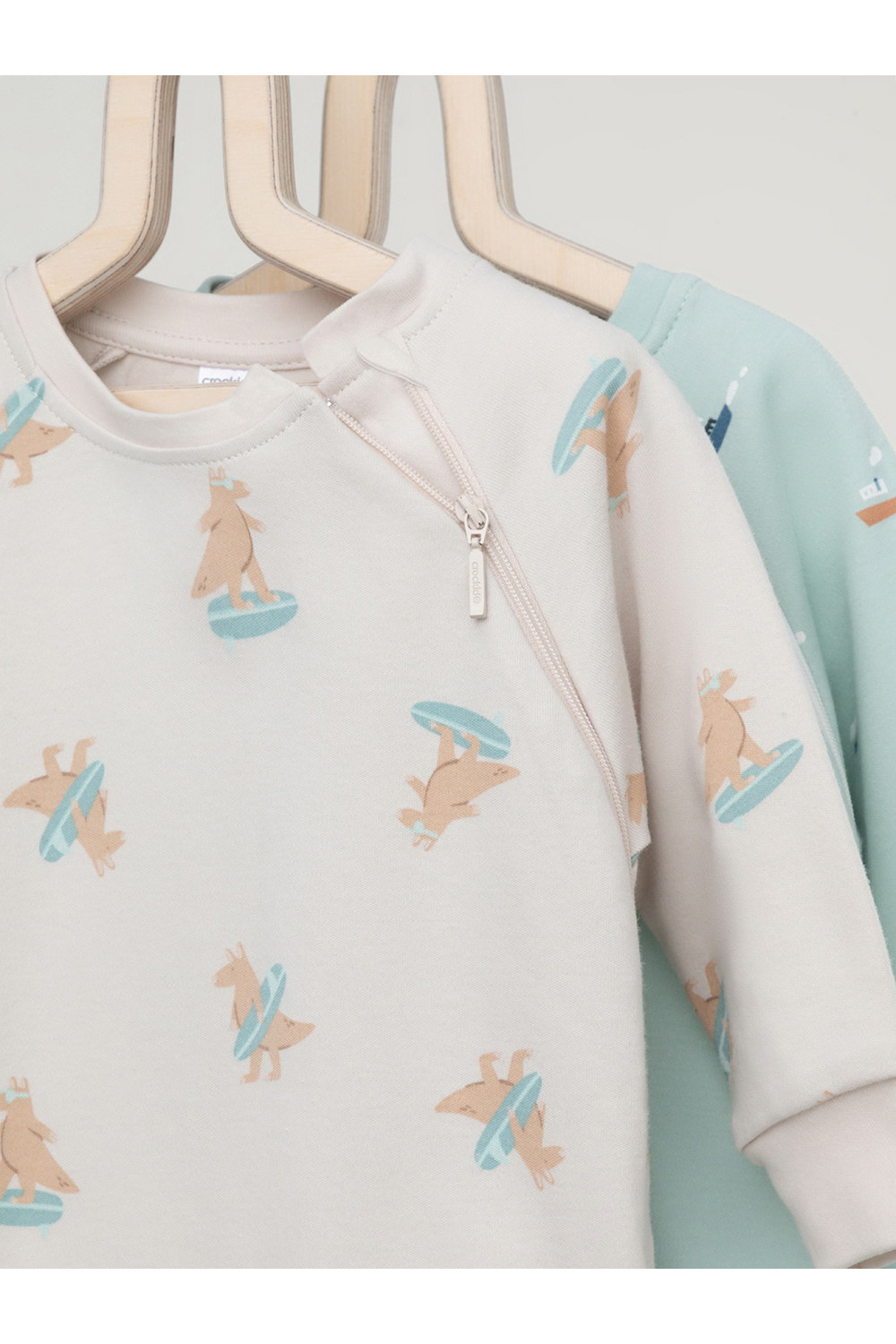 Комбинезоны для новорождённых из мягкого эластичного трикотажа интерлок, произведённого из натурального хлопка. В упаковке 2 штуки. Застёгиваются сбоку на молнию и на кнопку. Длинные рукава-реглан оканчиваются манжетами. Оригинальная набивка выполнена из стойких гипоаллергенных текстильных красителей. Все трикотажные полотна производятся в соответствии с нормами Швейцарского сертификата ЭкоТекс.