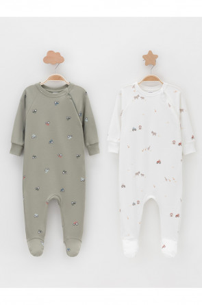 Комбинезоны для новорождённых из мягкого эластичного трикотажа интерлок, произведённого из натурального хлопка. В упаковке 2 штуки. Застёгиваются сбоку на молнию с мягкой защитой шеи и подбородка. Длинные рукава-реглан оканчиваются манжетами. Оригинальная набивка выполнена из стойких гипоаллергенных текстильных красителей. Все трикотажные полотна производятся в соответствии с нормами швейцарского сертификата ЭкоТекс.