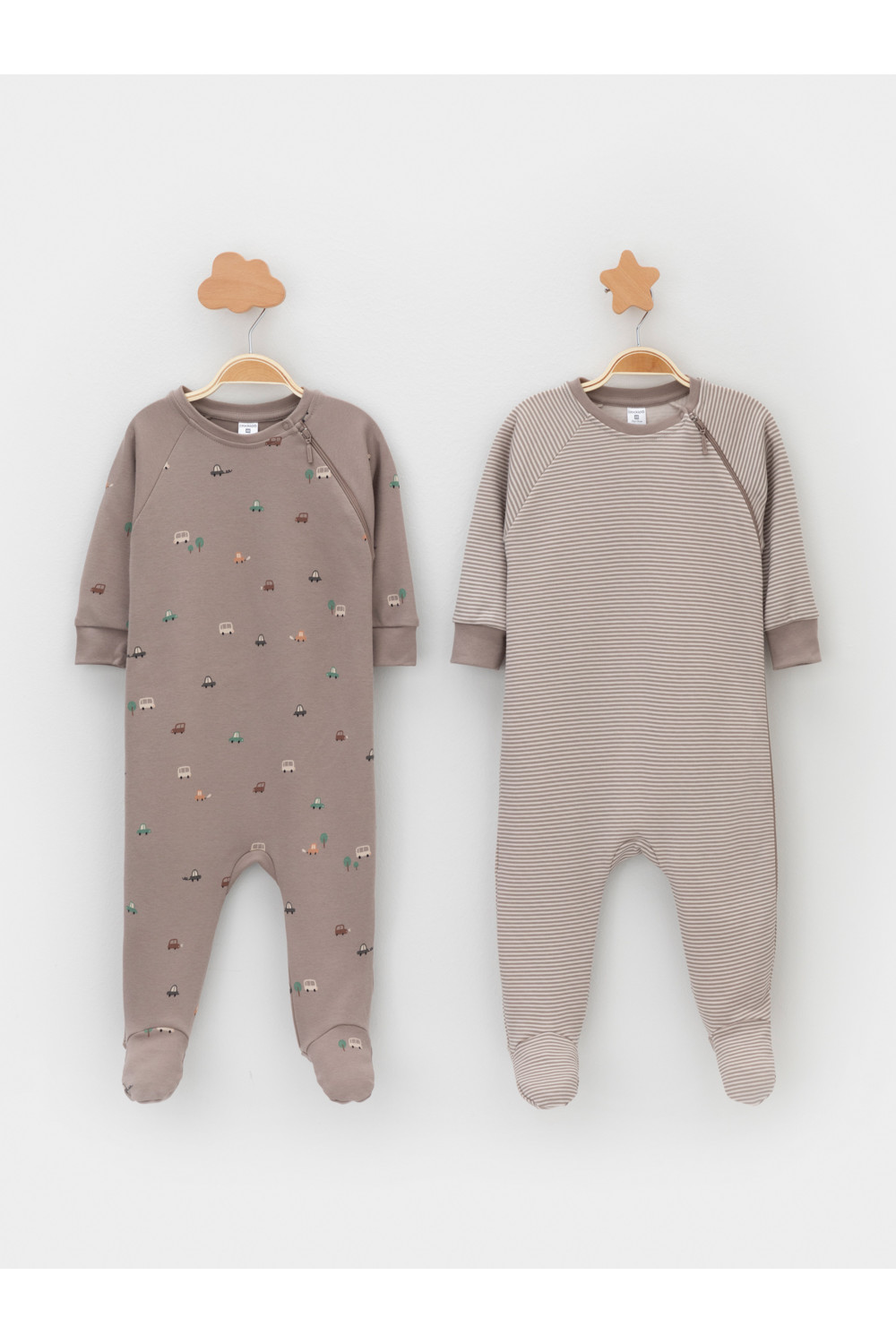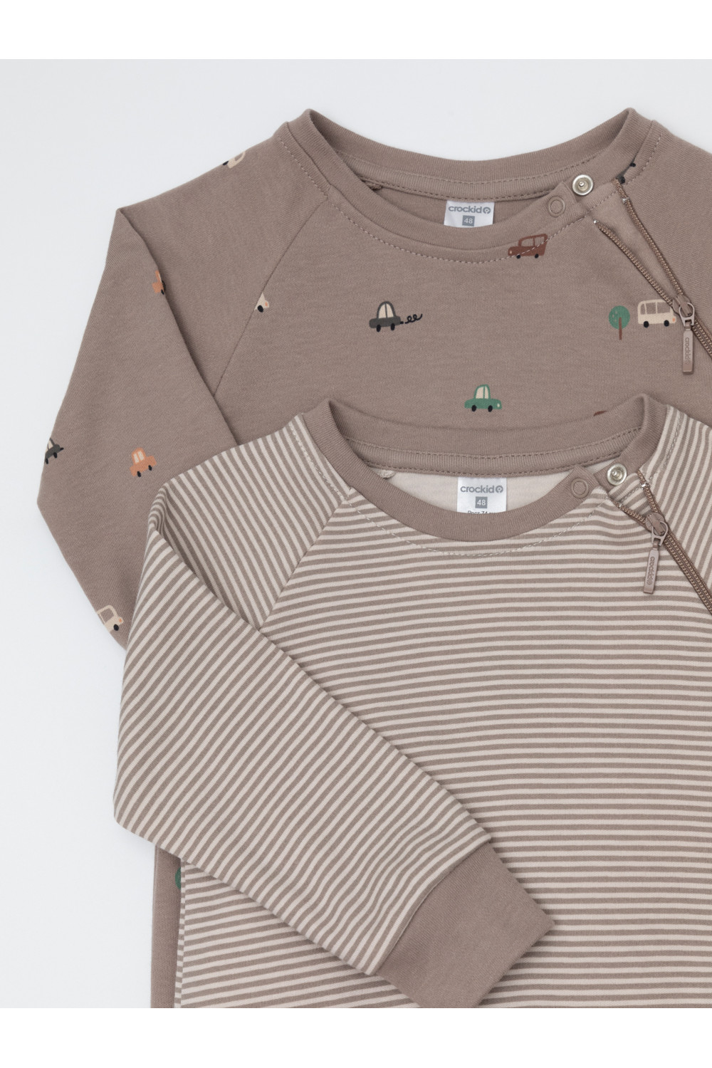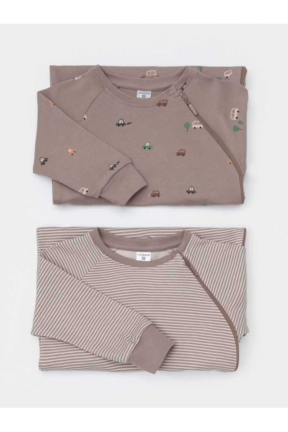 Комбинезоны для новорождённых из мягкого эластичного трикотажа интерлок, произведённого из натурального хлопка. В упаковке 2 штуки. Застёгиваются сбоку на молнию и на кнопку. Длинные рукава-реглан оканчиваются манжетами. Оригинальная набивка выполнена из стойких гипоаллергенных текстильных красителей. Все трикотажные полотна производятся в соответствии с нормами Швейцарского сертификата ЭкоТекс.