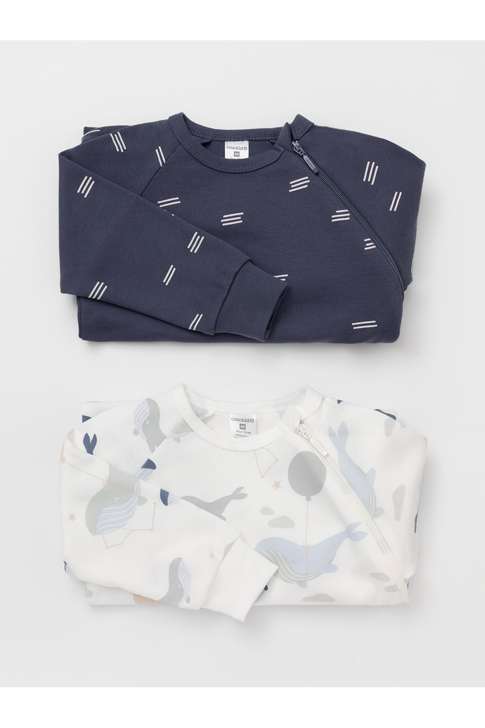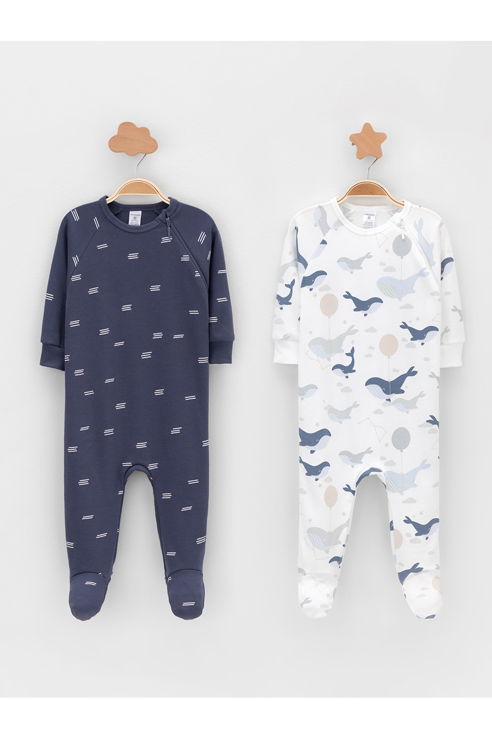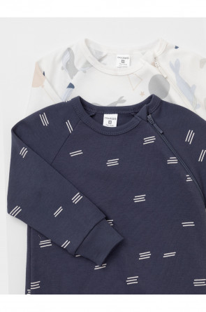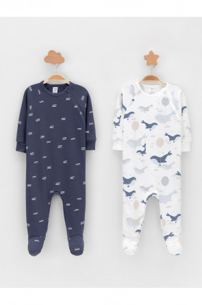 Комбинезоны для новорождённых из мягкого эластичного трикотажа интерлок, произведённого из натурального хлопка. В упаковке 2 штуки. Застёгиваются сбоку на молнию и на кнопку. Длинные рукава-реглан оканчиваются манжетами. Оригинальная набивка выполнена из стойких гипоаллергенных текстильных красителей. Все трикотажные полотна производятся в соответствии с нормами Швейцарского сертификата ЭкоТекс.