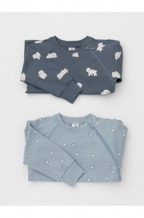 Комбинезоны для новорождённых из мягкого эластичного трикотажа интерлок, произведённого из натурального хлопка. В упаковке 2 штуки. Застёгиваются сбоку на молнию с мягкой защитой шеи и подбородка. Длинные рукава-реглан оканчиваются манжетами. Оригинальная набивка выполнена из стойких гипоаллергенных текстильных красителей. Все трикотажные полотна производятся в соответствии с нормами швейцарского сертификата ЭкоТекс.