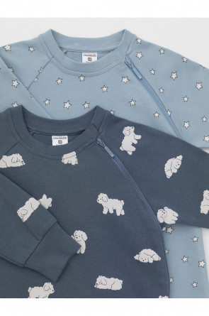 Комбинезоны для новорождённых из мягкого эластичного трикотажа интерлок, произведённого из натурального хлопка. В упаковке 2 штуки. Застёгиваются сбоку на молнию с мягкой защитой шеи и подбородка. Длинные рукава-реглан оканчиваются манжетами. Оригинальная набивка выполнена из стойких гипоаллергенных текстильных красителей. Все трикотажные полотна производятся в соответствии с нормами швейцарского сертификата ЭкоТекс.