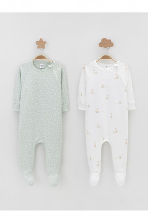 Комбинезоны для новорождённых из мягкого эластичного трикотажа интерлок, произведённого из натурального хлопка. В упаковке 2 штуки. Застёгиваются сбоку на молнию с мягкой защитой шеи и подбородка. Длинные рукава-реглан оканчиваются манжетами. Оригинальная набивка выполнена из стойких гипоаллергенных текстильных красителей. Все трикотажные полотна производятся в соответствии с нормами швейцарского сертификата ЭкоТекс.
