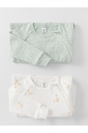 Комбинезоны для новорождённых из мягкого эластичного трикотажа интерлок, произведённого из натурального хлопка. В упаковке 2 штуки. Застёгиваются сбоку на молнию с мягкой защитой шеи и подбородка. Длинные рукава-реглан оканчиваются манжетами. Оригинальная набивка выполнена из стойких гипоаллергенных текстильных красителей. Все трикотажные полотна производятся в соответствии с нормами швейцарского сертификата ЭкоТекс.