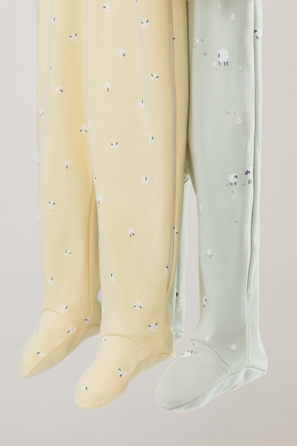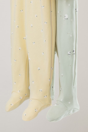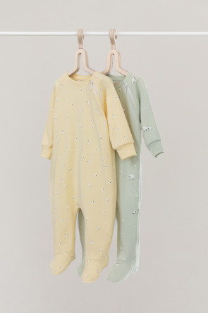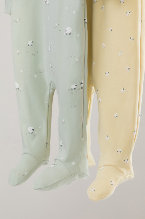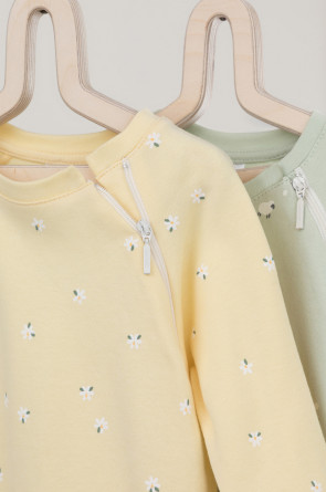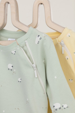 Комбинезоны для новорождённых из мягкого эластичного трикотажа интерлок, произведённого из натурального хлопка. В упаковке 2 штуки. Застёгиваются сбоку на молнию и на кнопку. Длинные рукава-реглан оканчиваются манжетами. Оригинальная набивка выполнена из стойких гипоаллергенных текстильных красителей. Все трикотажные полотна производятся в соответствии с нормами Швейцарского сертификата ЭкоТекс.