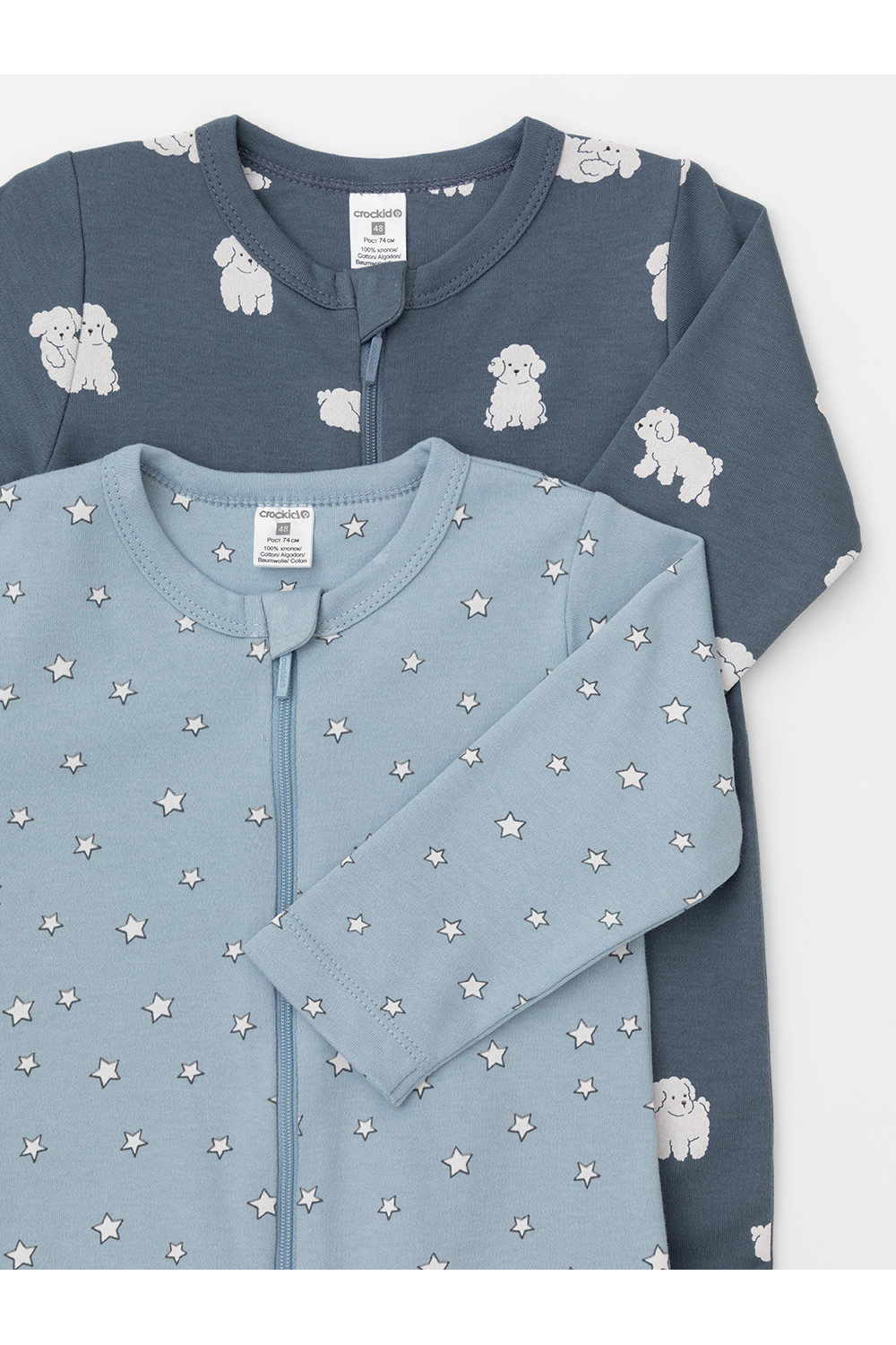 Комбинезоны для новорождённых из эластичного трикотажа, произведённого из натурального хлопка. В упаковке 2 штуки. Застёгиваются спереди на молнию с мягкой защитой шеи и подбородка. По шаговому шву застёжка на кнопки. Оригинальная набивка выполнена из стойких гипоаллергенных текстильных красителей. Все трикотажные полотна производятся в соответствии с нормами швейцарского сертификата ЭкоТекс.