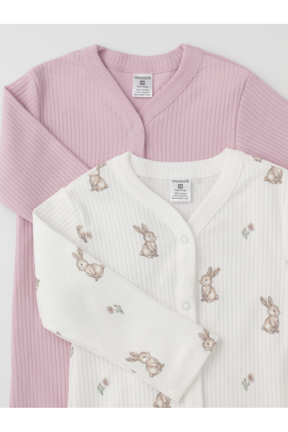 Комбинезоны для новорождённых из мягкого эластичного трикотажа, произведённого из натурального хлопка. В упаковке 2 штуки. Застёгиваются спереди на кнопки. В размере 56 на рукавах предусмотрены антицарапки, швы выполнены наружу. Все трикотажные полотна производятся в соответствии с нормами швейцарского сертификата ЭкоТекс.