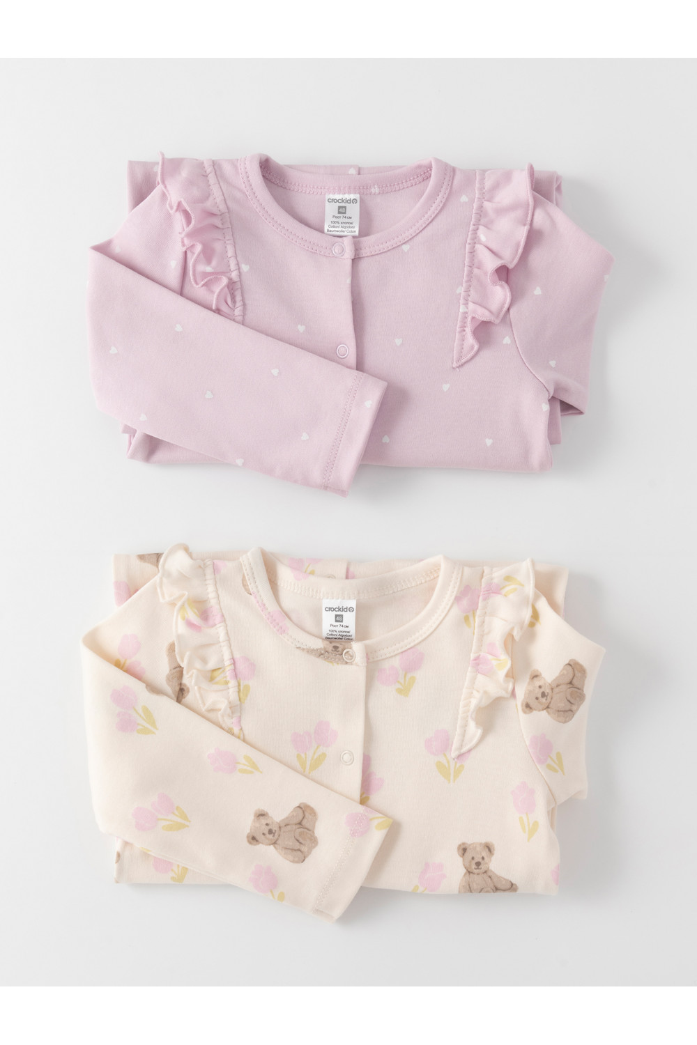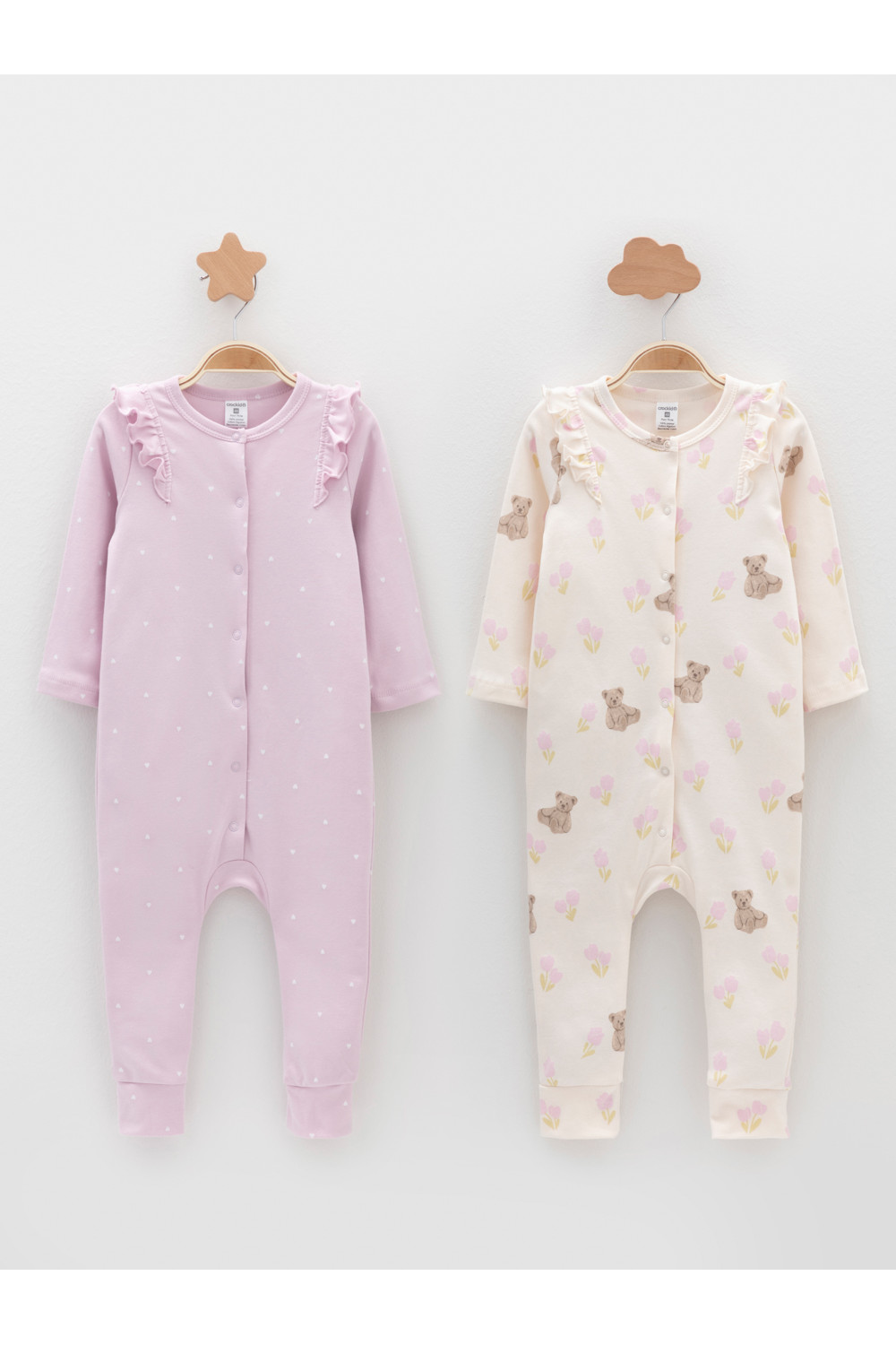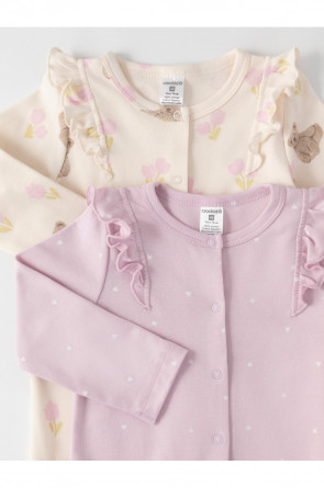 Комбинезоны для новорождённых из мягкого эластичного трикотажа, произведённого из натурального хлопка. В упаковке 2 штуки. Застёгиваются спереди на кнопки. Украшены воздушными крылышками. Оригинальная набивка выполнена из стойких гипоаллергенных текстильных красителей. Все трикотажные полотна производятся в соответствии с нормами швейцарского сертификата ЭкоТекс.