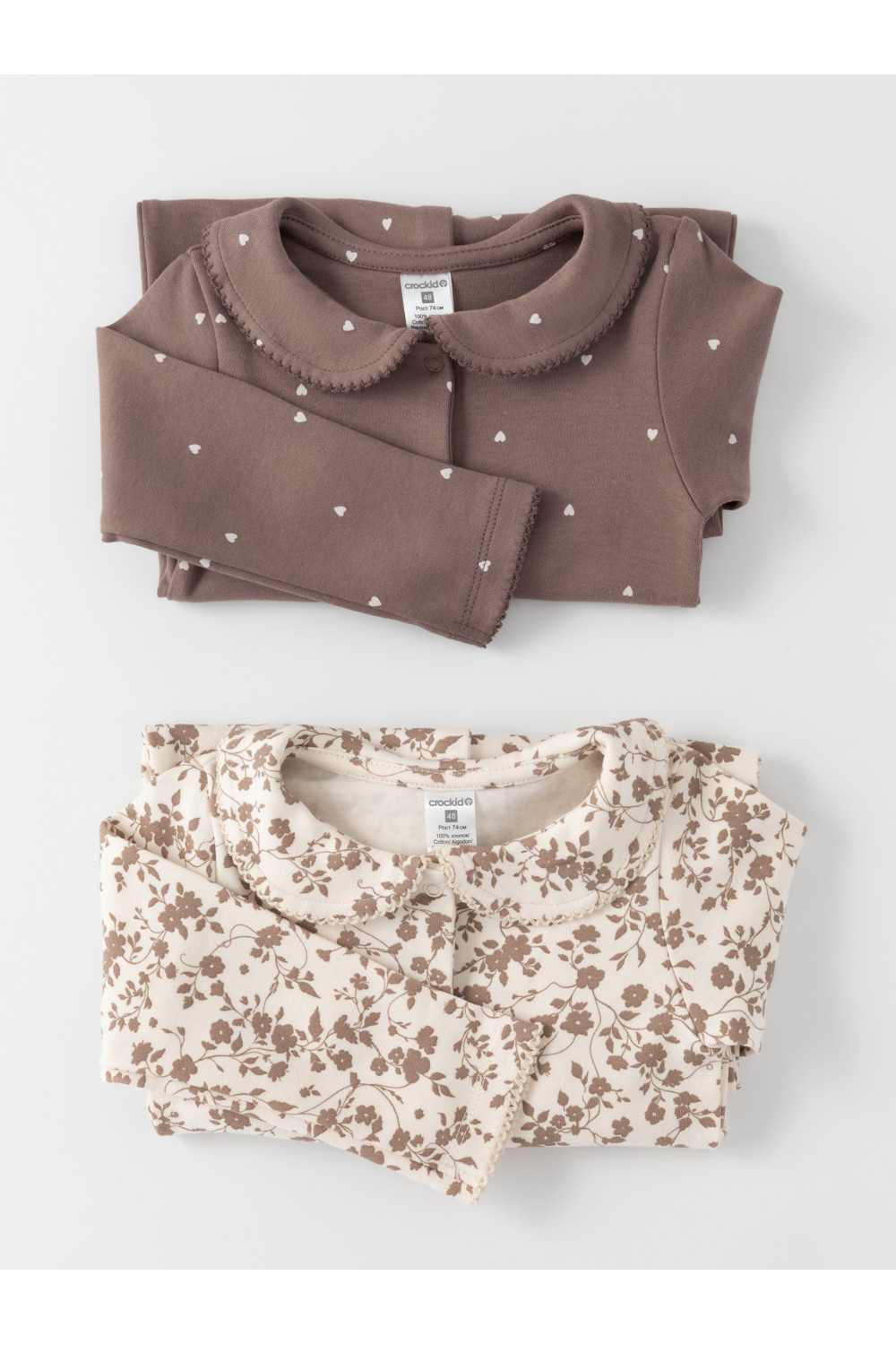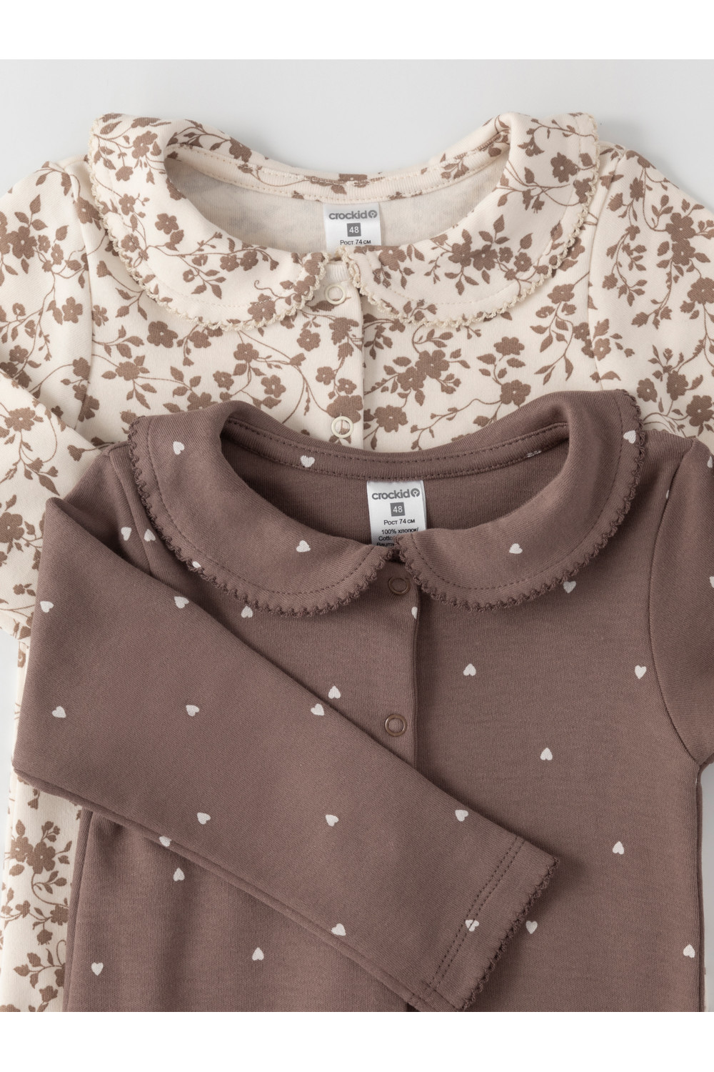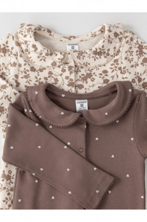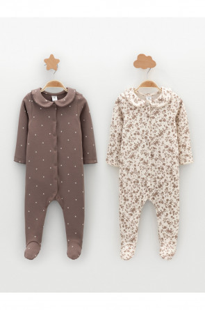 Комбинезоны для новорождённых из мягкого эластичного трикотажа, произведённого из натурального хлопка. В упаковке 2 штуки. Застёгиваются спереди на кнопки. В размере 56 на рукавах предусмотрены антицарапки, швы выполнены наружу. Украшены воротничком. Оригинальная набивка выполнена из стойких гипоаллергенных текстильных красителей. Все трикотажные полотна производятся в соответствии с нормами швейцарского сертификата ЭкоТекс.