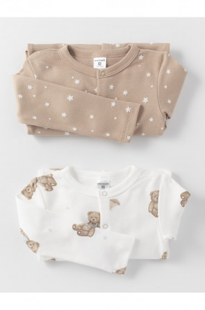 Комбинезоны для новорождённых из мягкого эластичного трикотажа, произведённого из натурального хлопка. В упаковке 2 штуки. Застёгиваются спереди на кнопки. В размере 56 на рукавах предусмотрены антицарапки, швы выполнены наружу. Оригинальная набивка выполнена из стойких гипоаллергенных текстильных красителей. Все трикотажные полотна производятся в соответствии с нормами швейцарского сертификата ЭкоТекс.