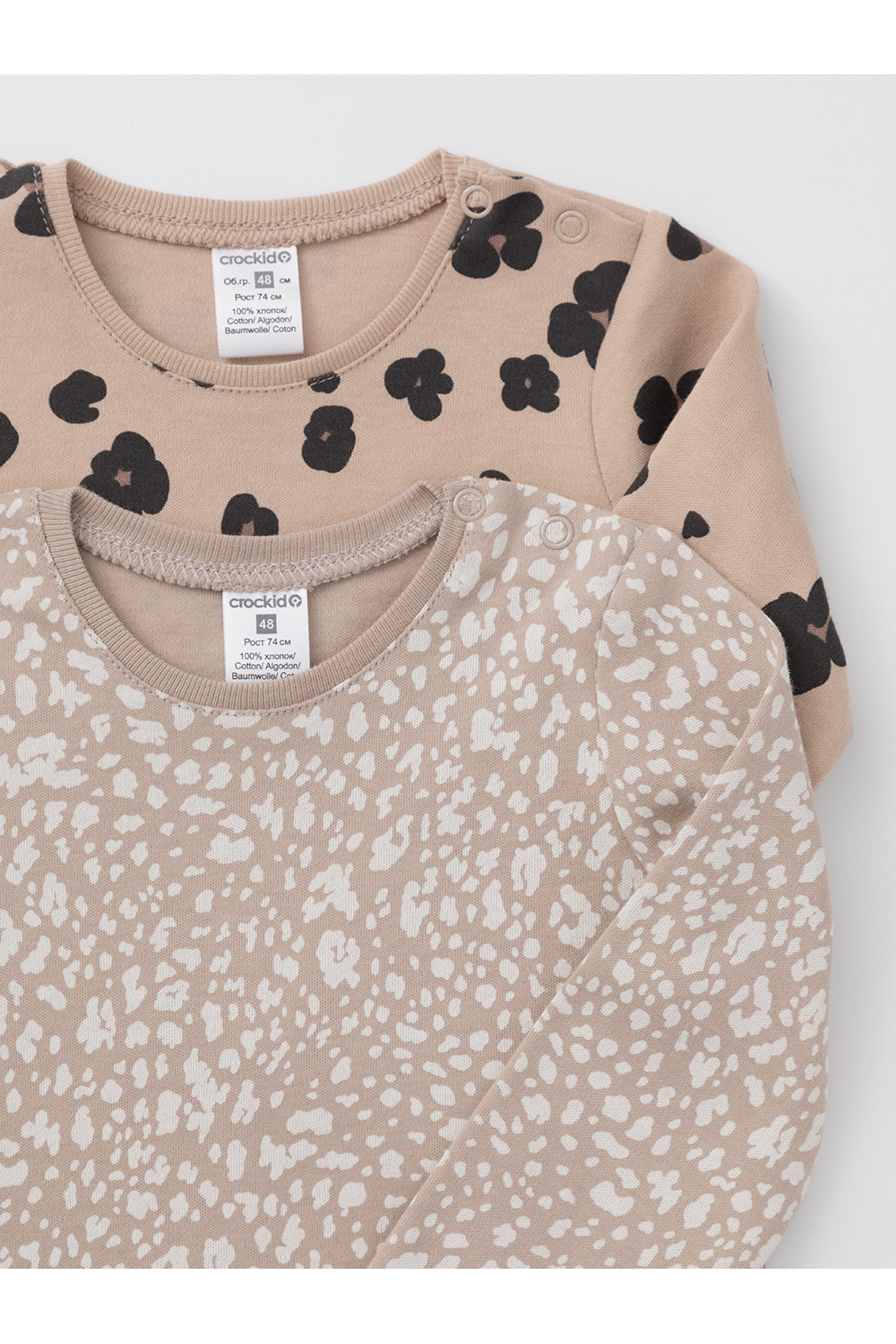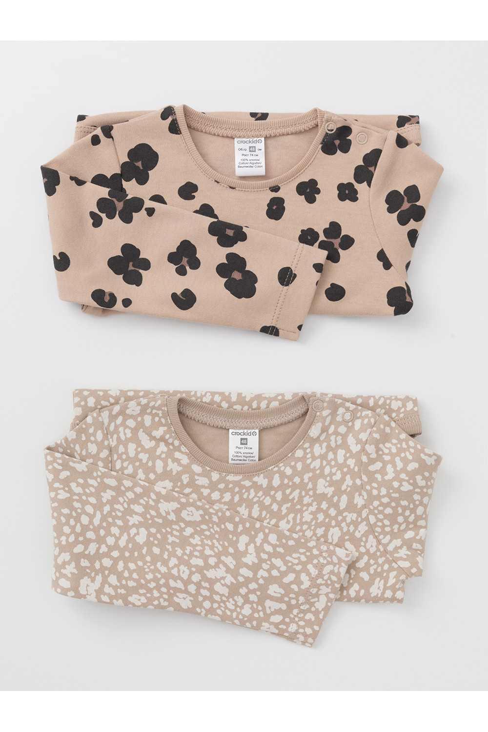 Боди для новорождённых из мягкого эластичного трикотажа, произведённого из натурального хлопка. В упаковке 2 штуки. Застёгиваются на кнопки на плече и по низу изделий. Оригинальная набивка и принт выполнены из стойких гипоаллергенных текстильных красителей. Все трикотажные полотна производятся в соответствии с нормами швейцарского сертификата ЭкоТекс.