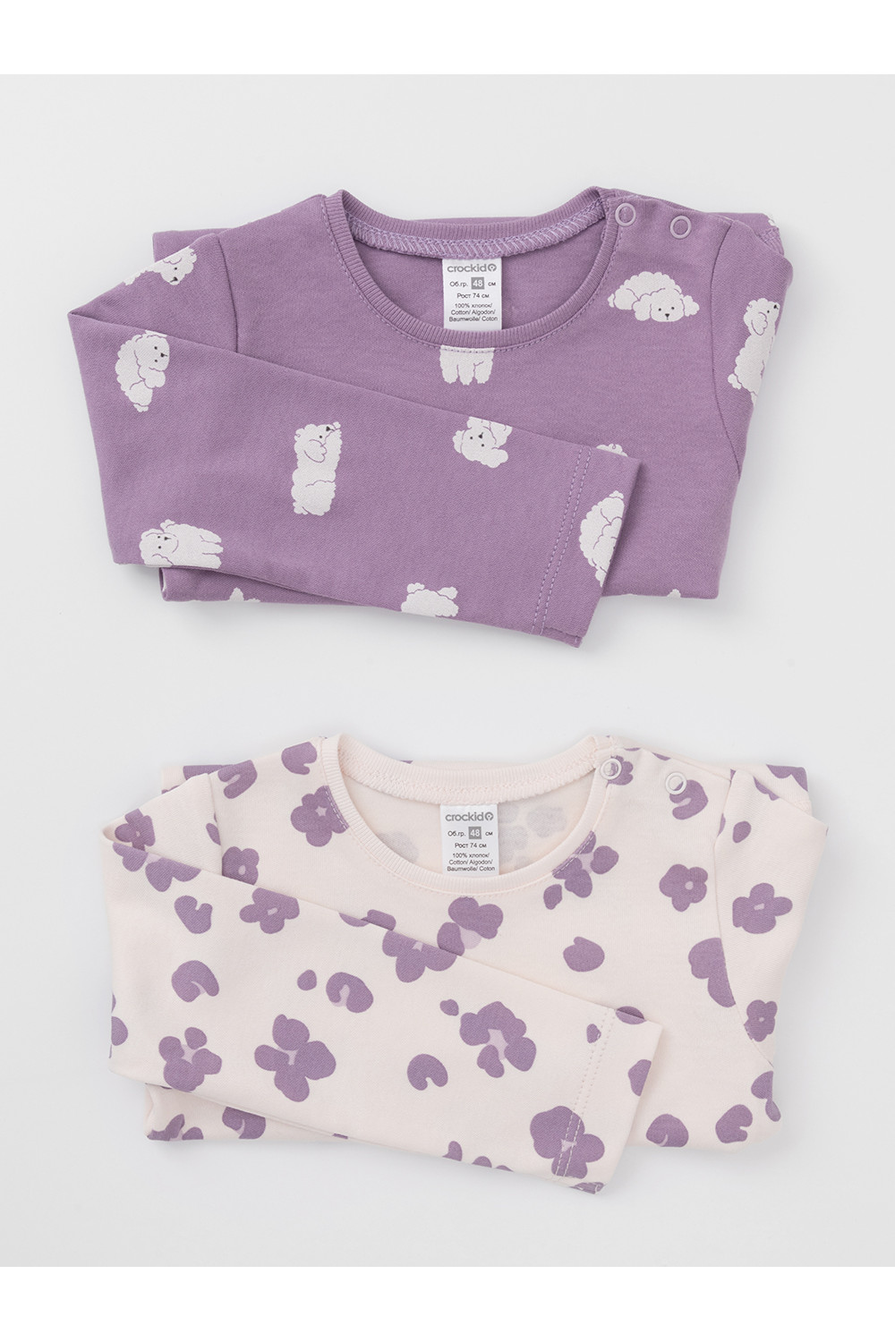 Боди для новорождённых из мягкого эластичного трикотажа, произведённого из натурального хлопка. В упаковке 2 штуки. Застёгиваются на кнопки на плече и по низу изделий. Оригинальная набивка и принт выполнены из стойких гипоаллергенных текстильных красителей. Все трикотажные полотна производятся в соответствии с нормами швейцарского сертификата ЭкоТекс.