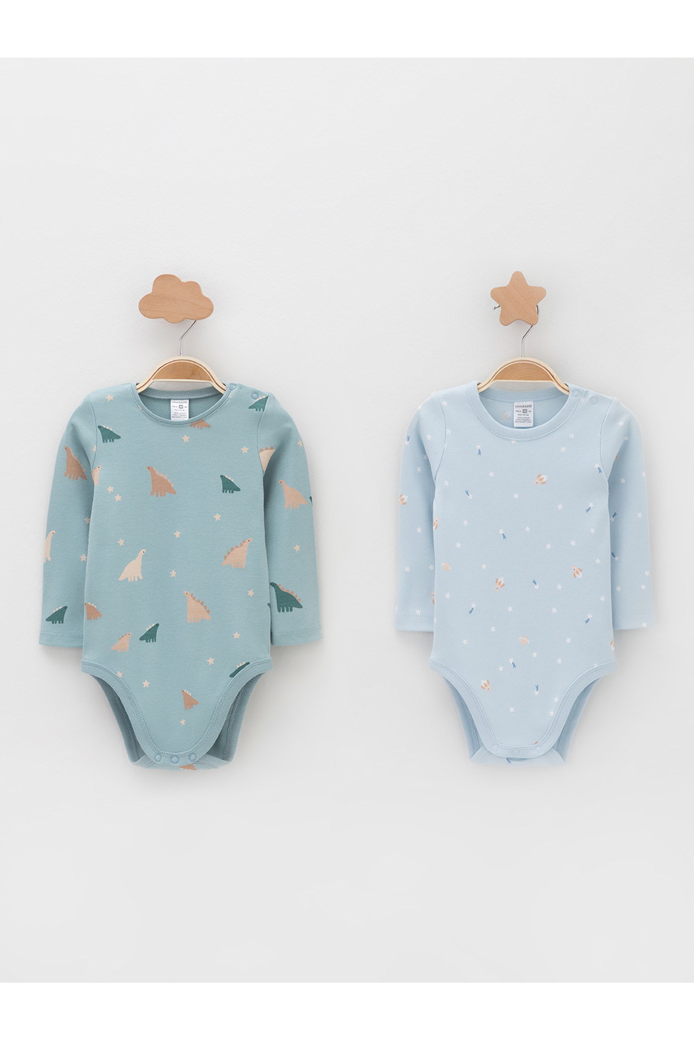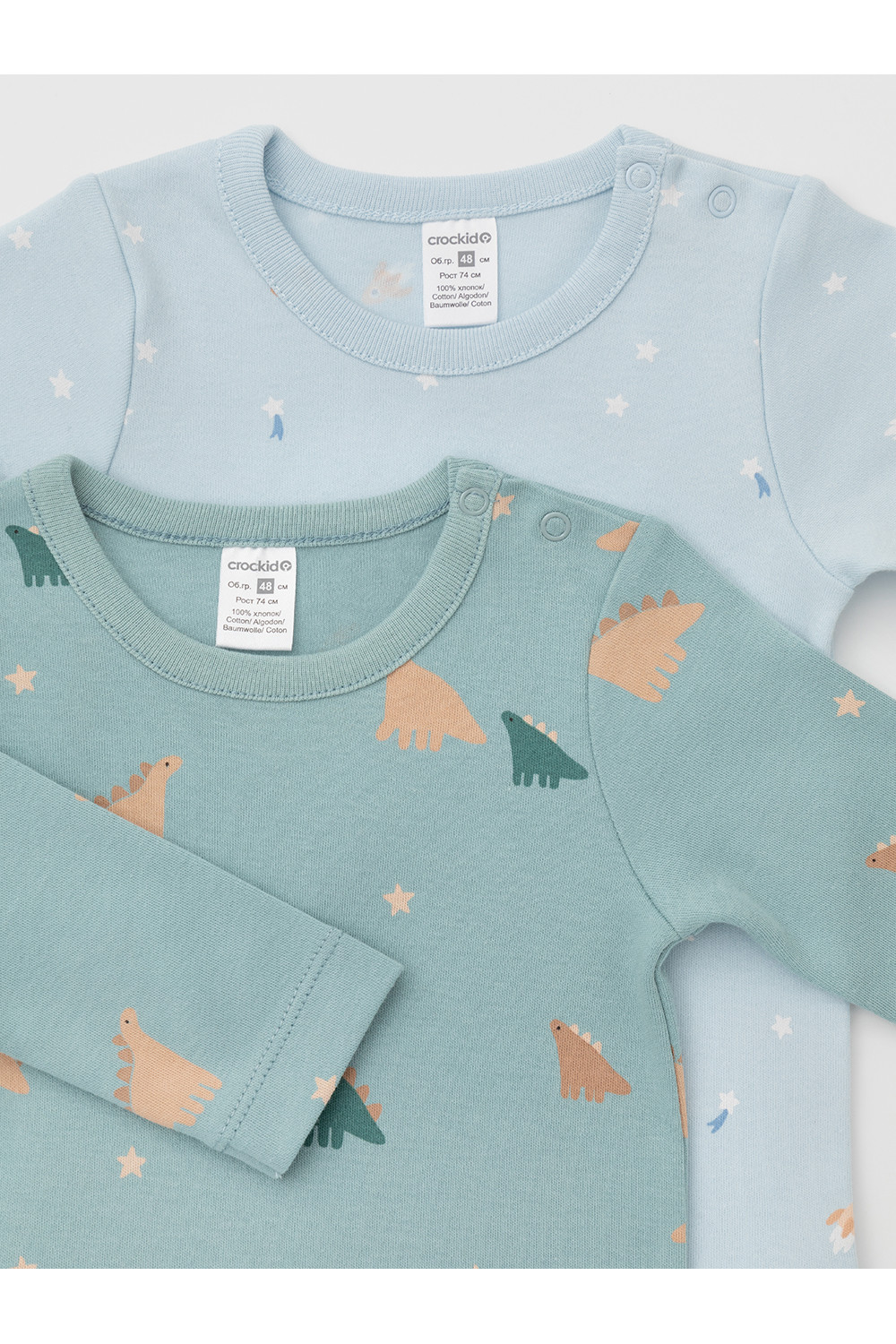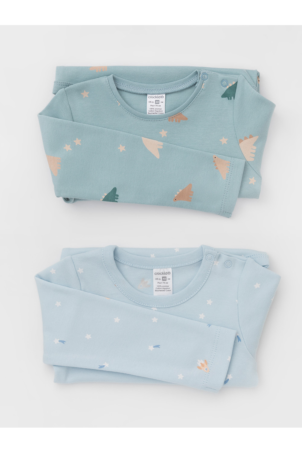 Боди для новорождённых из мягкого эластичного трикотажа, произведённого из натурального хлопка. В упаковке 2 штуки. Застёгиваются на кнопки на плече и по низу изделий. Оригинальная набивка и принт выполнены из стойких гипоаллергенных текстильных красителей. Все трикотажные полотна производятся в соответствии с нормами швейцарского сертификата ЭкоТекс.