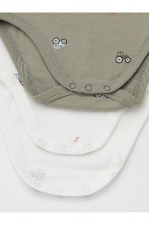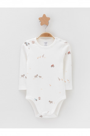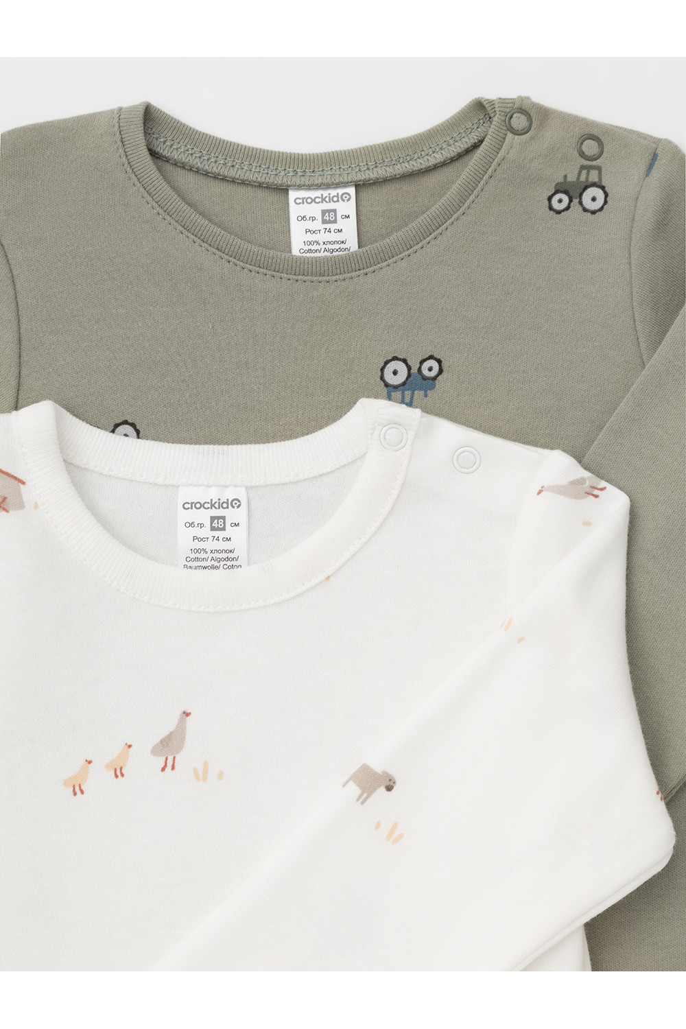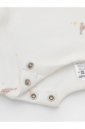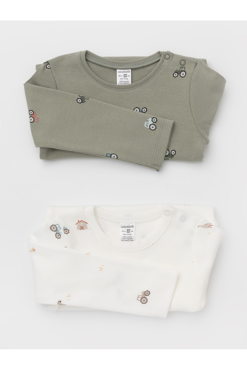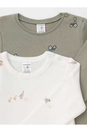 Боди для новорождённых из мягкого эластичного трикотажа, произведённого из натурального хлопка. В упаковке 2 штуки. Застёгиваются на кнопки на плече и по низу изделий. Оригинальная набивка и принт выполнены из стойких гипоаллергенных текстильных красителей. Все трикотажные полотна производятся в соответствии с нормами швейцарского сертификата ЭкоТекс.