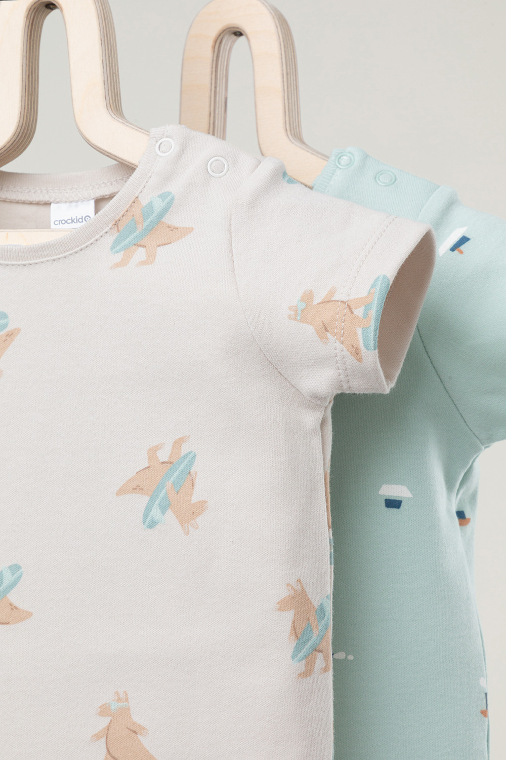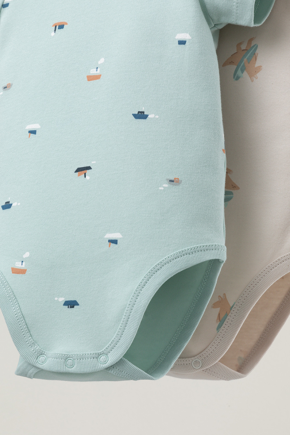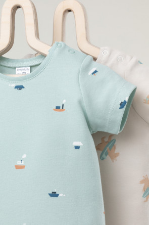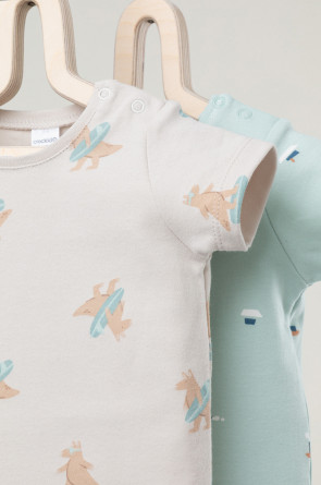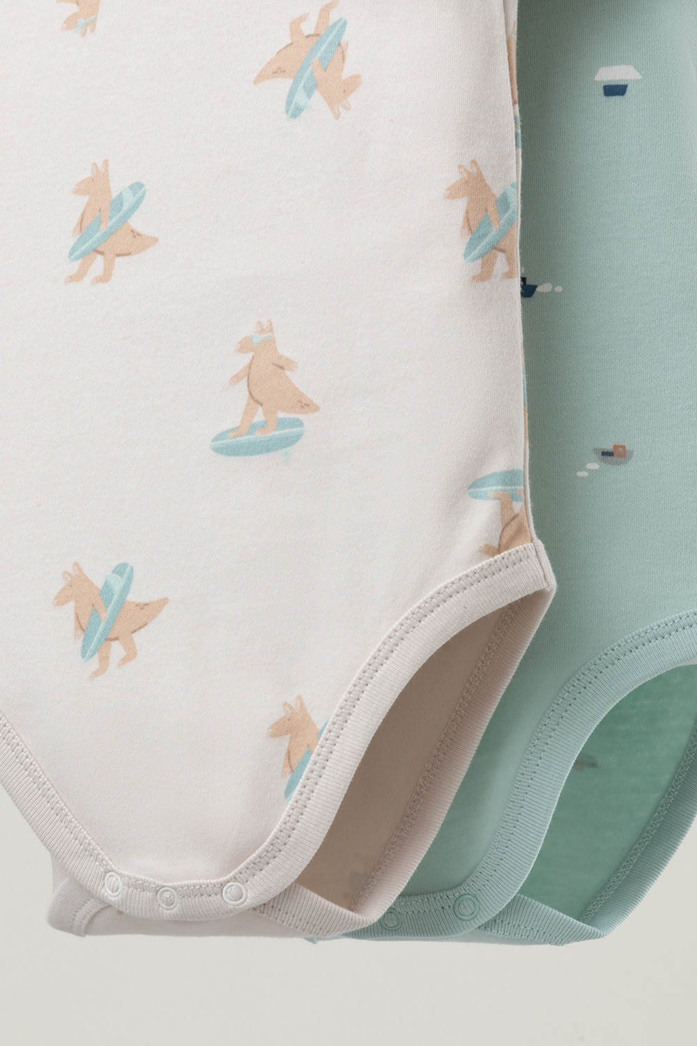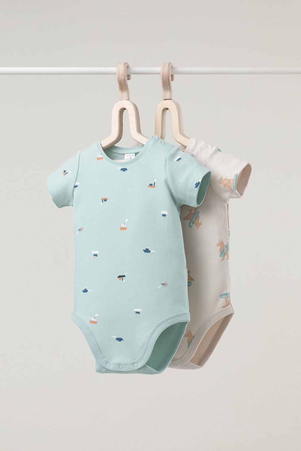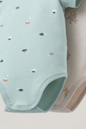 Боди для новорождённых из мягкого эластичного трикотажа, произведённого из натурального хлопка. В упаковке 2 штуки. Застёгиваются на кнопки на плече и по низу изделий. Оригинальная набивка выполнена из стойких гипоаллергенных текстильных красителей. Все трикотажные полотна производятся в соответствии с нормами Швейцарского сертификата ЭкоТекс.
