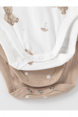 Боди для новорождённых из мягкого эластичного трикотажа, произведённого из натурального хлопка. В упаковке 2 штуки. Застёгиваются на кнопки спереди и по низу изделий. Оригинальная набивка выполнена из стойких гипоаллергенных текстильных красителей. Все трикотажные полотна производятся в соответствии с нормами швейцарского сертификата ЭкоТекс.