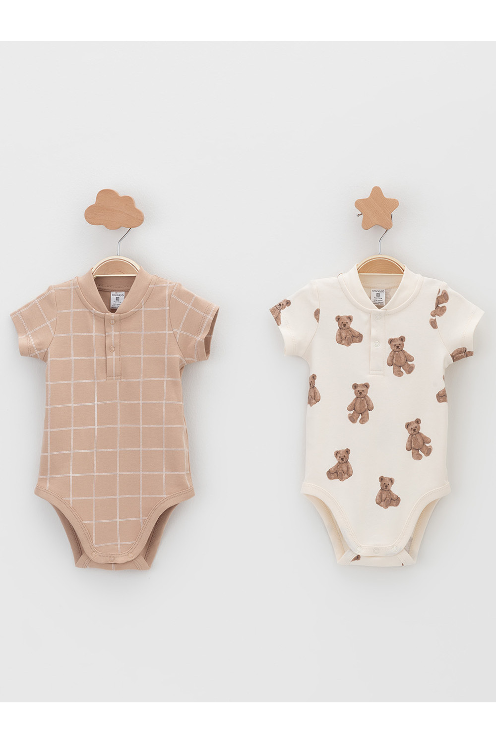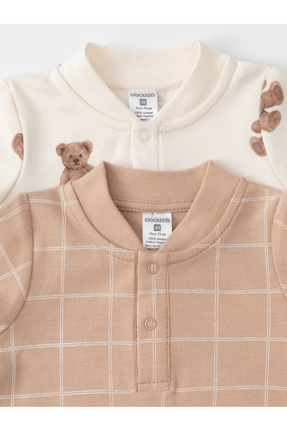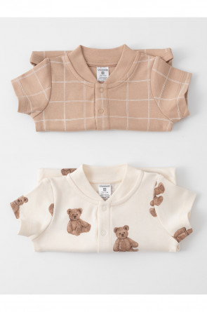 Боди для новорождённых из мягкого эластичного трикотажа, произведённого из натурального хлопка. В упаковке 2 штуки. Застёгиваются на кнопки спереди и по низу изделий. Оригинальная набивка выполнена из стойких гипоаллергенных текстильных красителей. Все трикотажные полотна производятся в соответствии с нормами швейцарского сертификата ЭкоТекс.