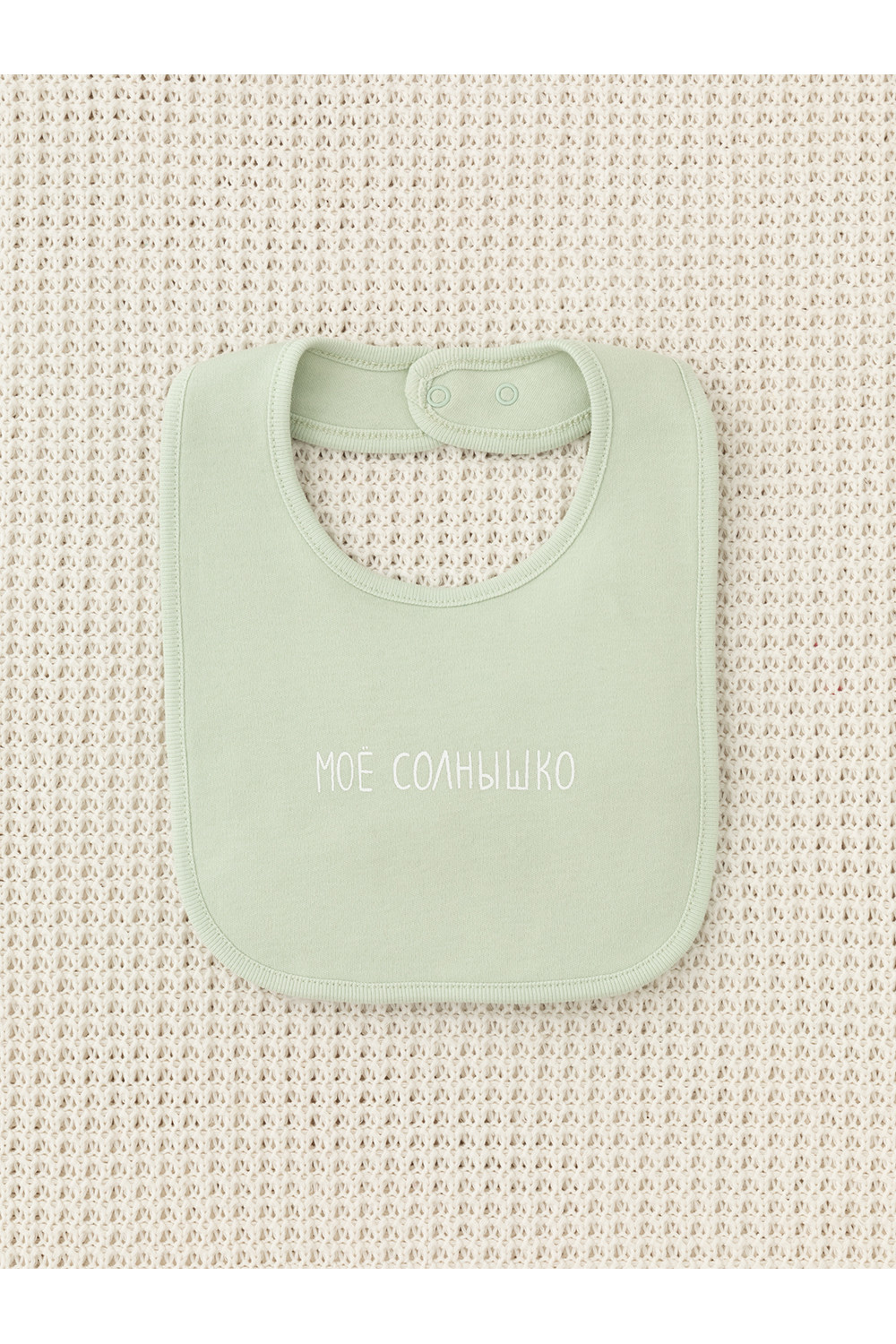 Нагрудник для новорождённых из мягкого эластичного трикотажа интерлок, произведённого из натурального хлопка. Застёгивается на кнопки. Украшен принтом. Все трикотажные полотна производятся в соответствии с нормами Швейцарского сертификата ЭкоТекс.