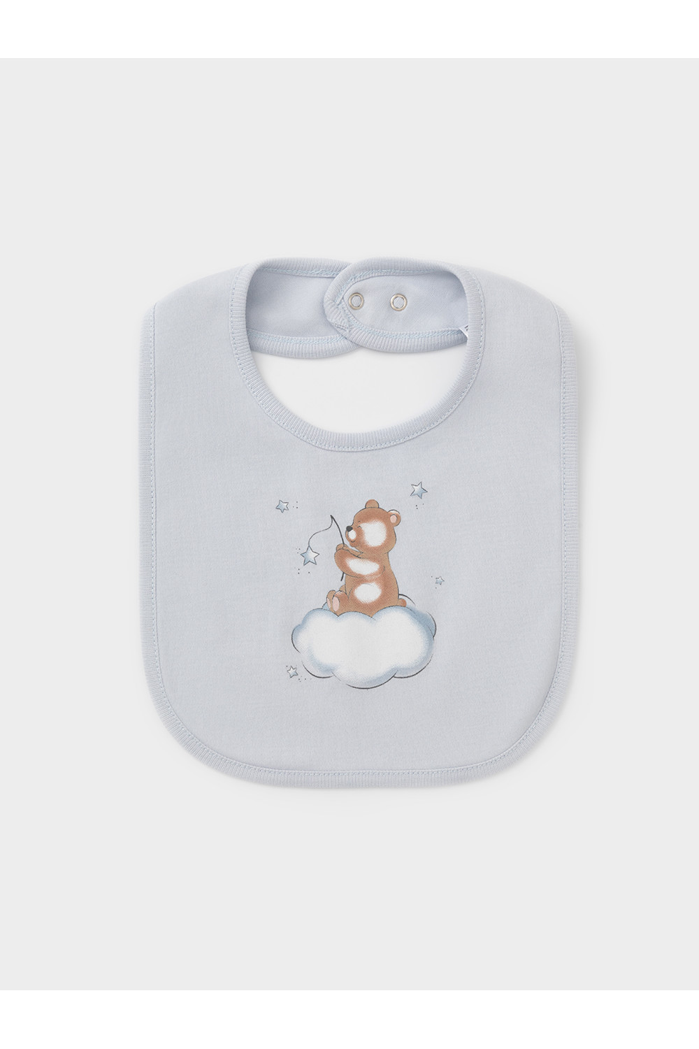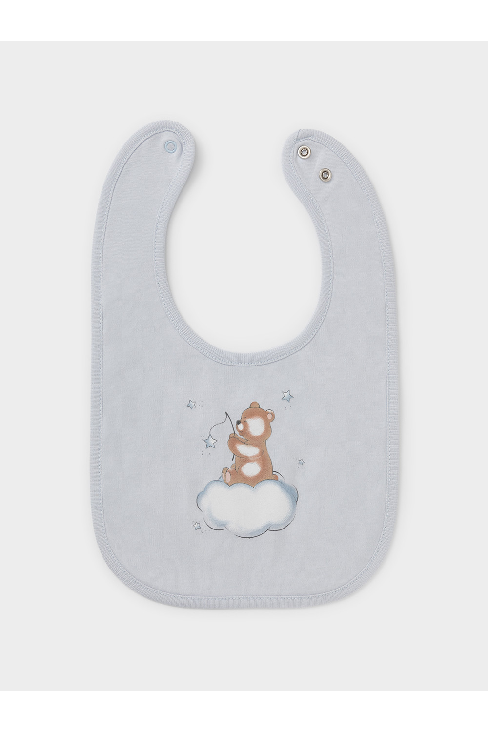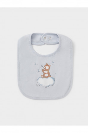 Нагрудник для новорождённых из мягкого эластичного трикотажа интерлок, произведённого из натурального хлопка. Застёгивается на кнопки. Украшен принтом. Все трикотажные полотна производятся в соответствии с нормами швейцарского сертификата ЭкоТекс.
