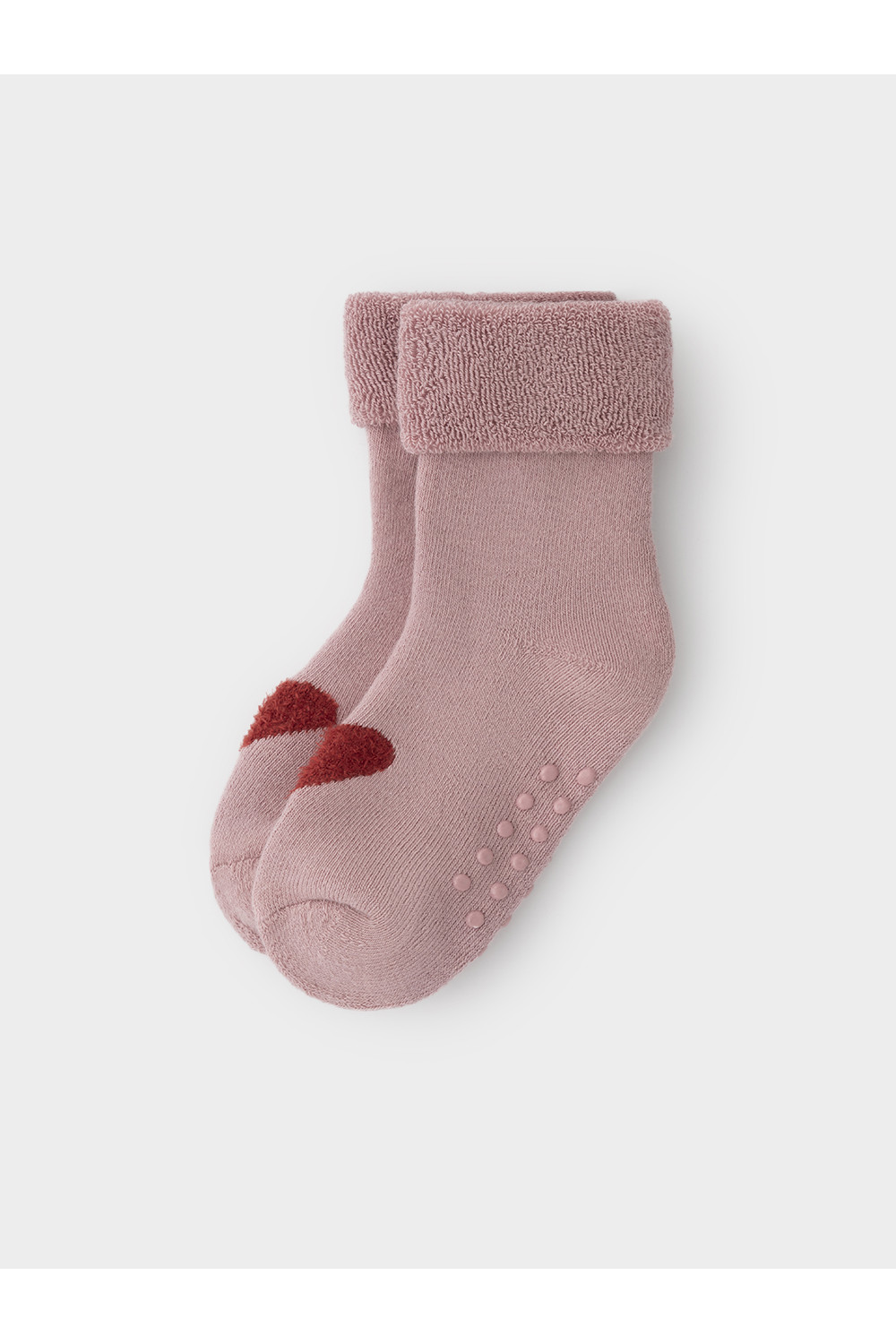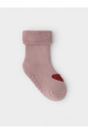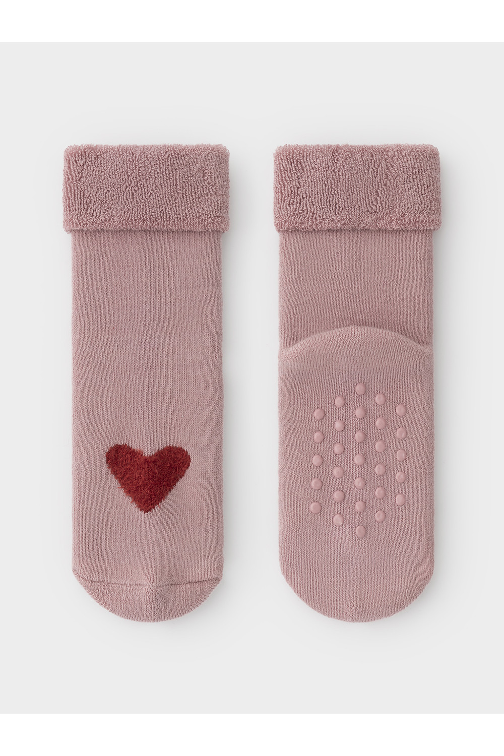 Носки махровые с формованной пяткой и отворотом по краю. На подошве резиновые стопперы. Украшены рисунком. Изделие сохраняет форму и стойкий цвет после многочисленных стирок.