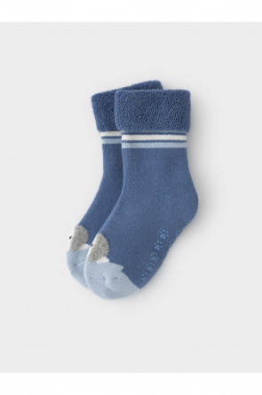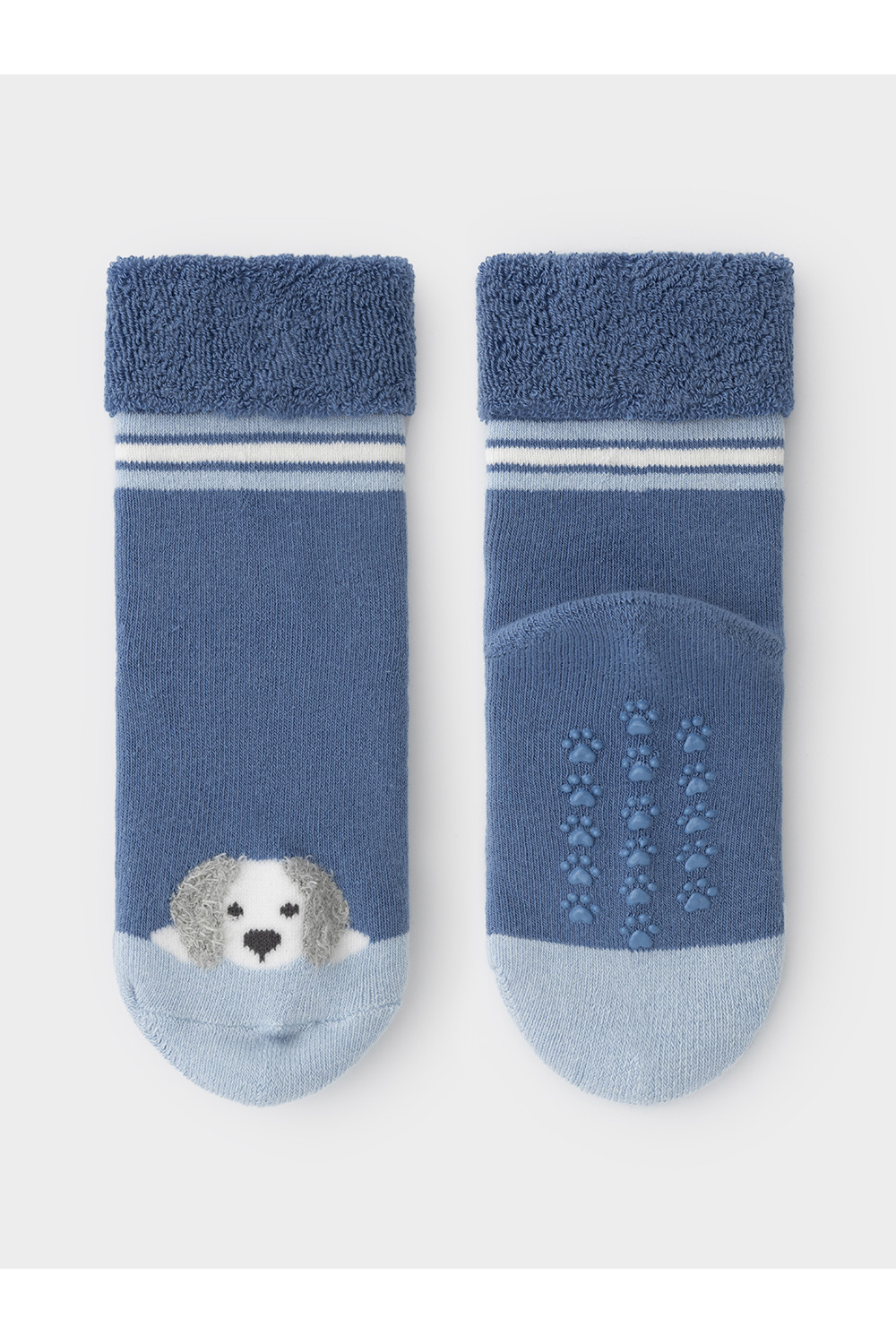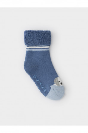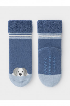 Носки махровые с формованной пяткой и отворотом по краю. На подошве резиновые стопперы. Украшены рисунком. Изделие сохраняет форму и стойкий цвет после многочисленных стирок.