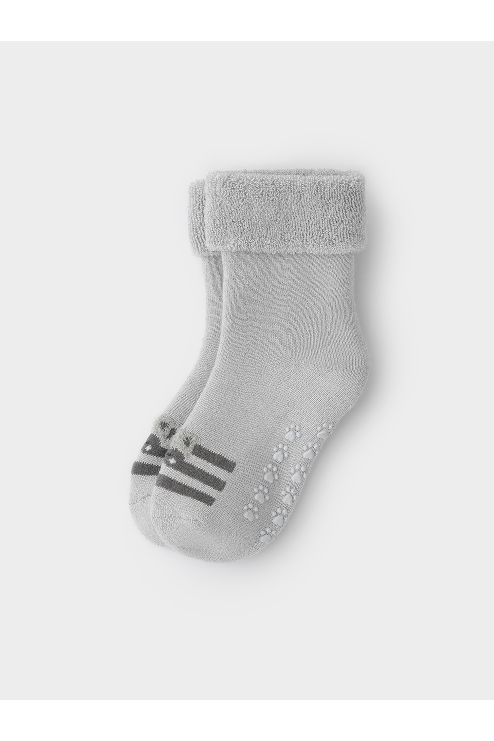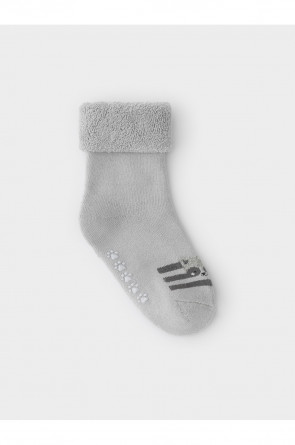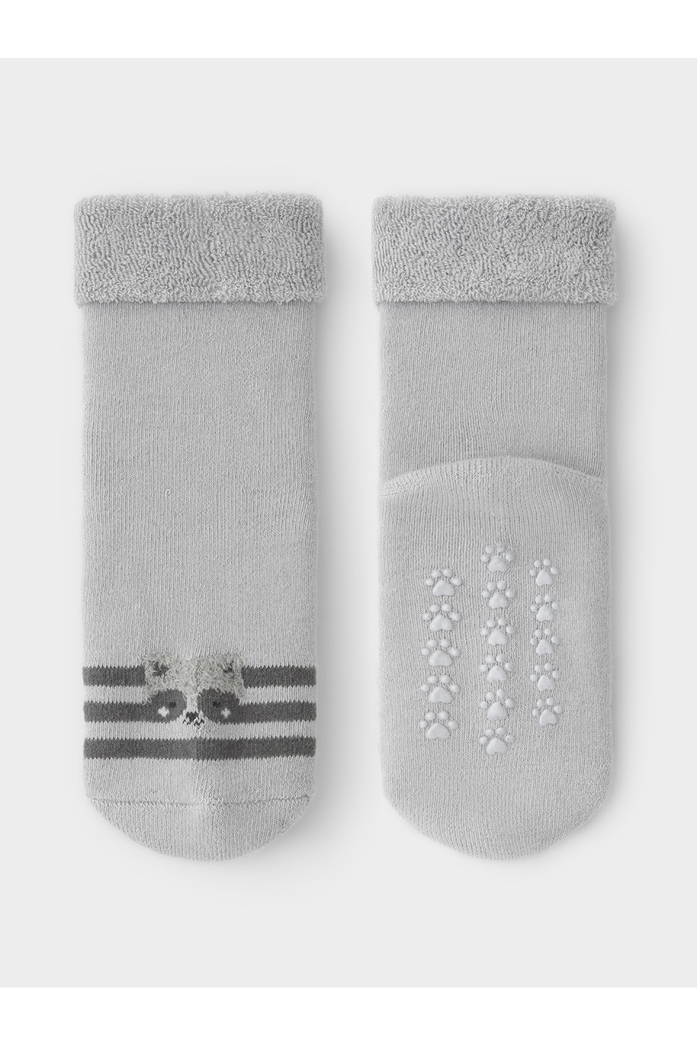 Носки махровые с формованной пяткой и отворотом по краю. На подошве резиновые стопперы. Украшены рисунком. Изделие сохраняет форму и стойкий цвет после многочисленных стирок.