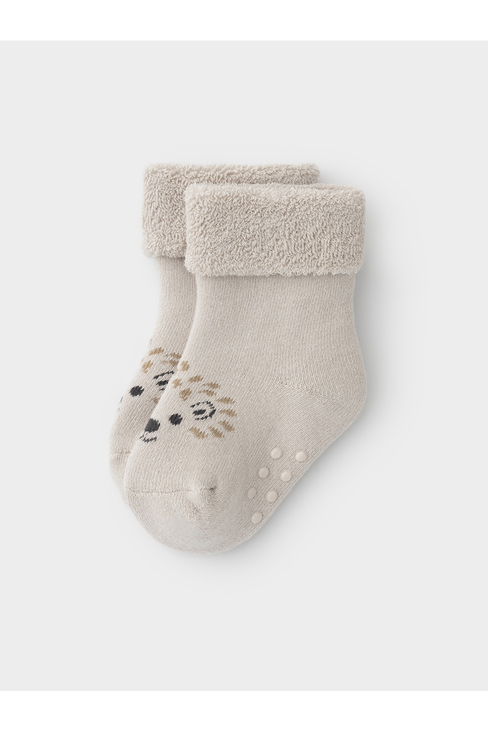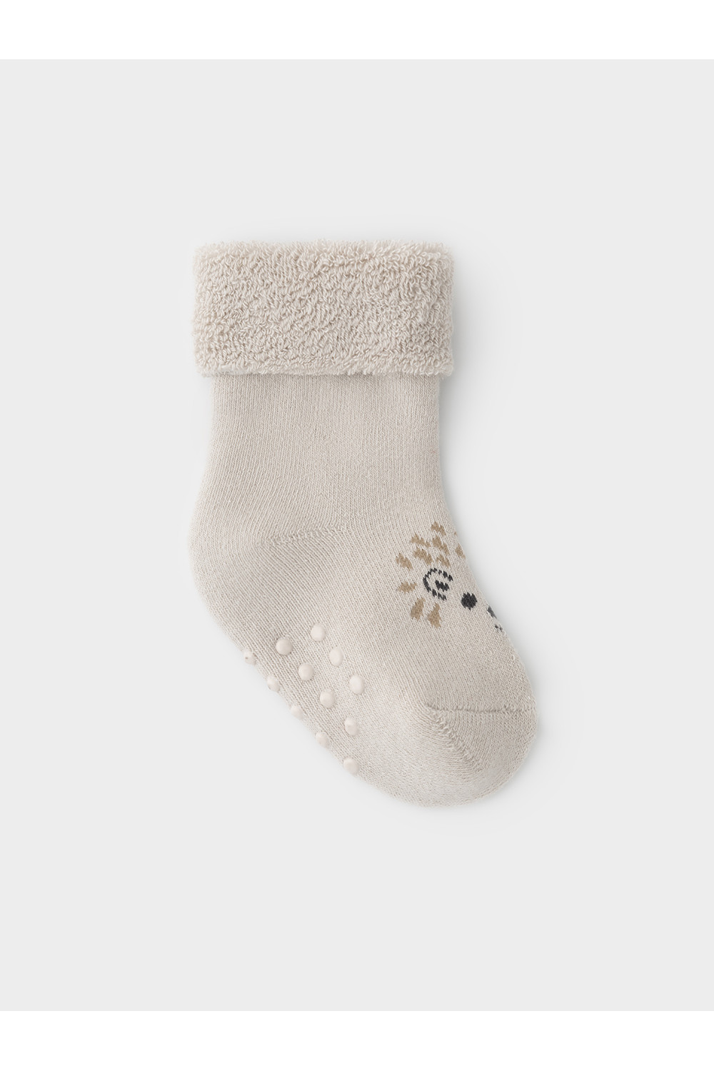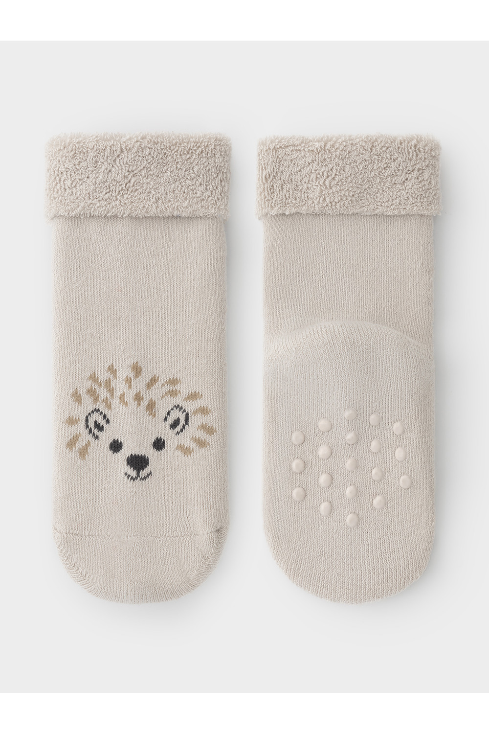 Носки махровые с формованной пяткой и отворотом по краю. На подошве резиновые стопперы. Украшены рисунком. Изделие сохраняет форму и стойкий цвет после многочисленных стирок.