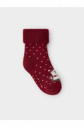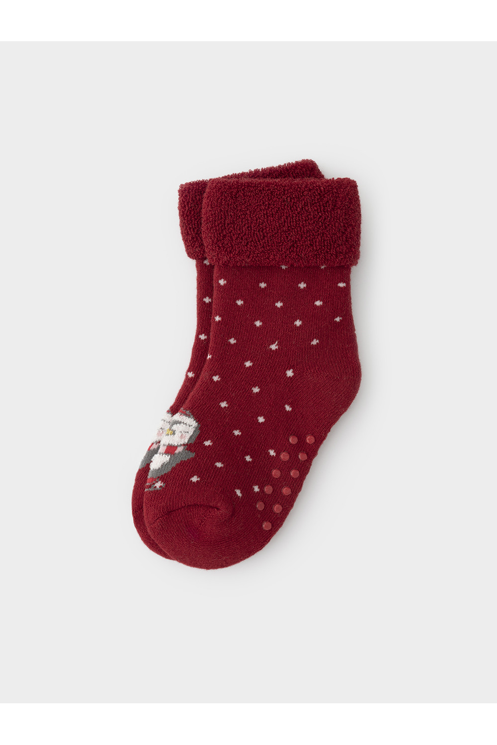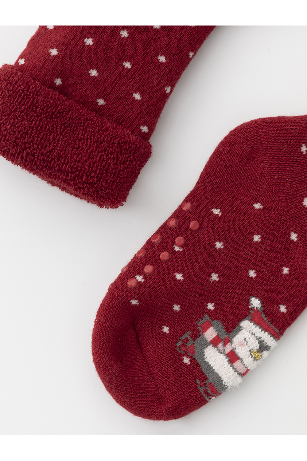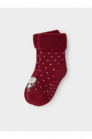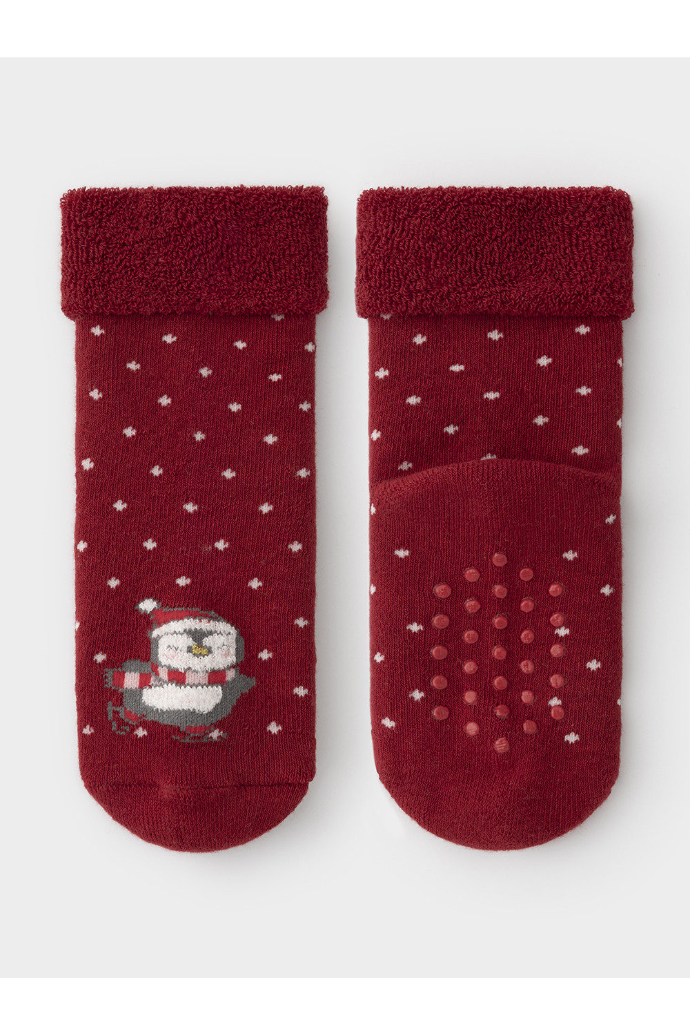 Тёплые махровые носки с формованной пяткой и отворотом по краю. На подошве резиновые стопперы. Украшены рисунком. Отлично подойдут для создания праздничных образов или как дополнение к подарку на Новый год и Рождество. Изделие сохраняет форму и стойкий цвет после многочисленных стирок.