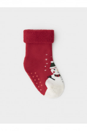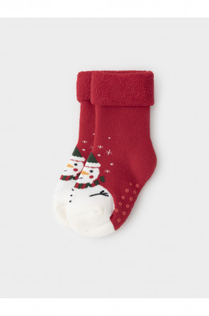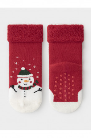 Тёплые махровые носки с формованной пяткой и отворотом по краю. На подошве резиновые стопперы. Украшены рисунком. Отлично подойдут для создания праздничных образов или как дополнение к подарку на Новый год и Рождество. Изделие сохраняет форму и стойкий цвет после многочисленных стирок.