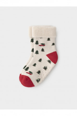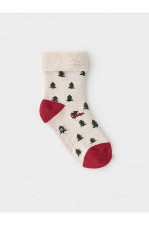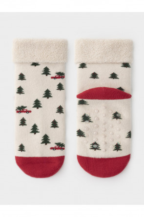 Тёплые махровые носки с формованной пяткой и отворотом по краю. На подошве резиновые стопперы. Украшены рисунком. Отлично подойдут для создания праздничных образов или как дополнение к подарку на Новый год и Рождество. Изделие сохраняет форму и стойкий цвет после многочисленных стирок.