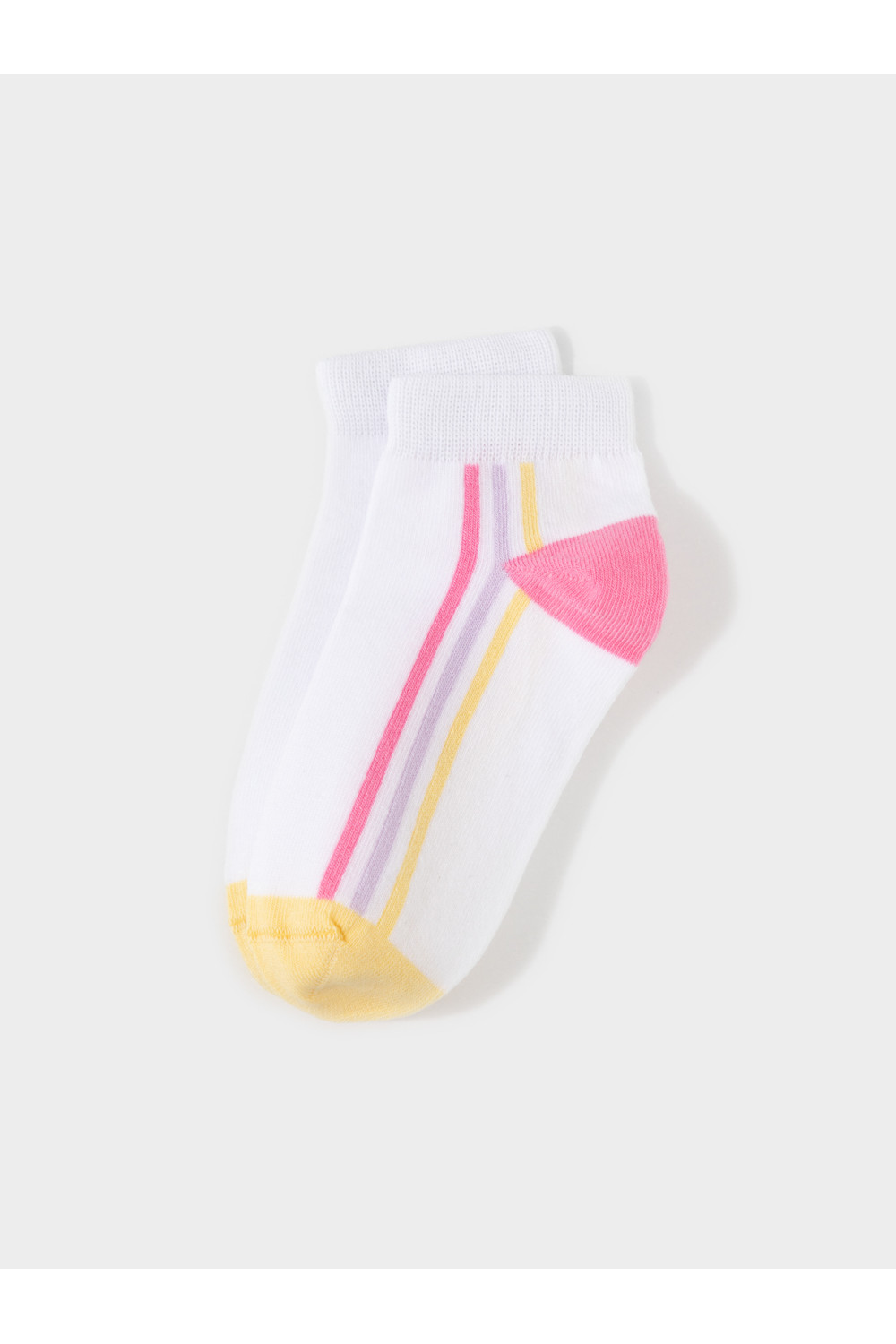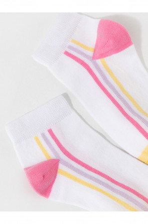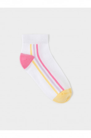 Носки короткие детские с формованной пяткой и эластичной резинкой по краю. Украшены рисунком с полосками. Изделие сохраняет форму и стойкий цвет после многочисленных стирок.