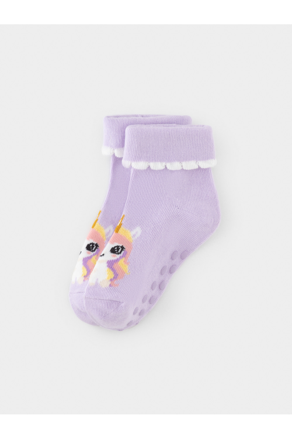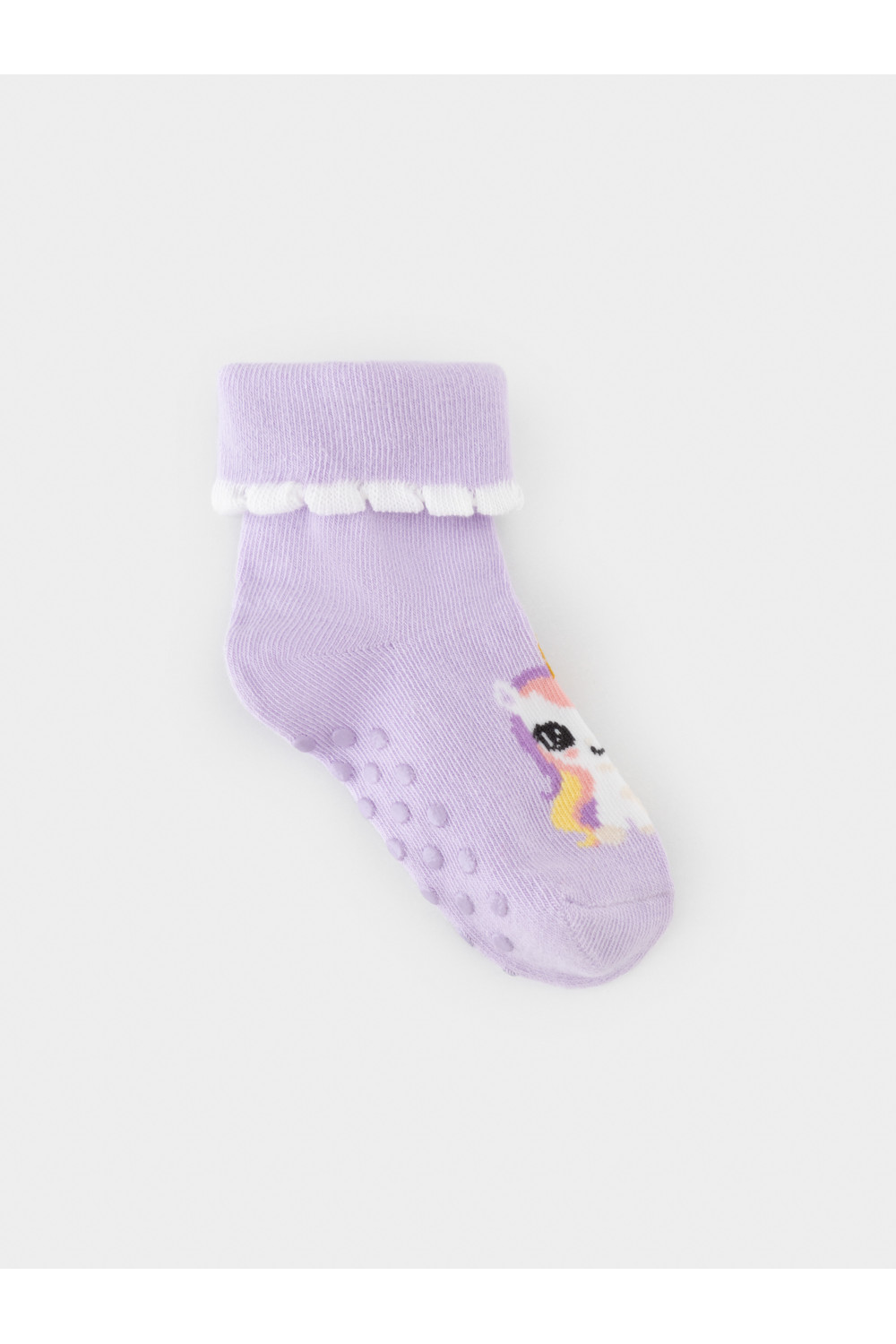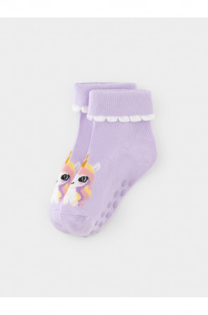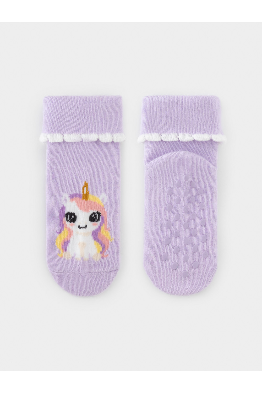 Носки детские с формованной пяткой и отворотом. Украшены рисунком. На стопе противоскользящие стопперы. Изделие сохраняет форму и стойкий цвет после многочисленных стирок.